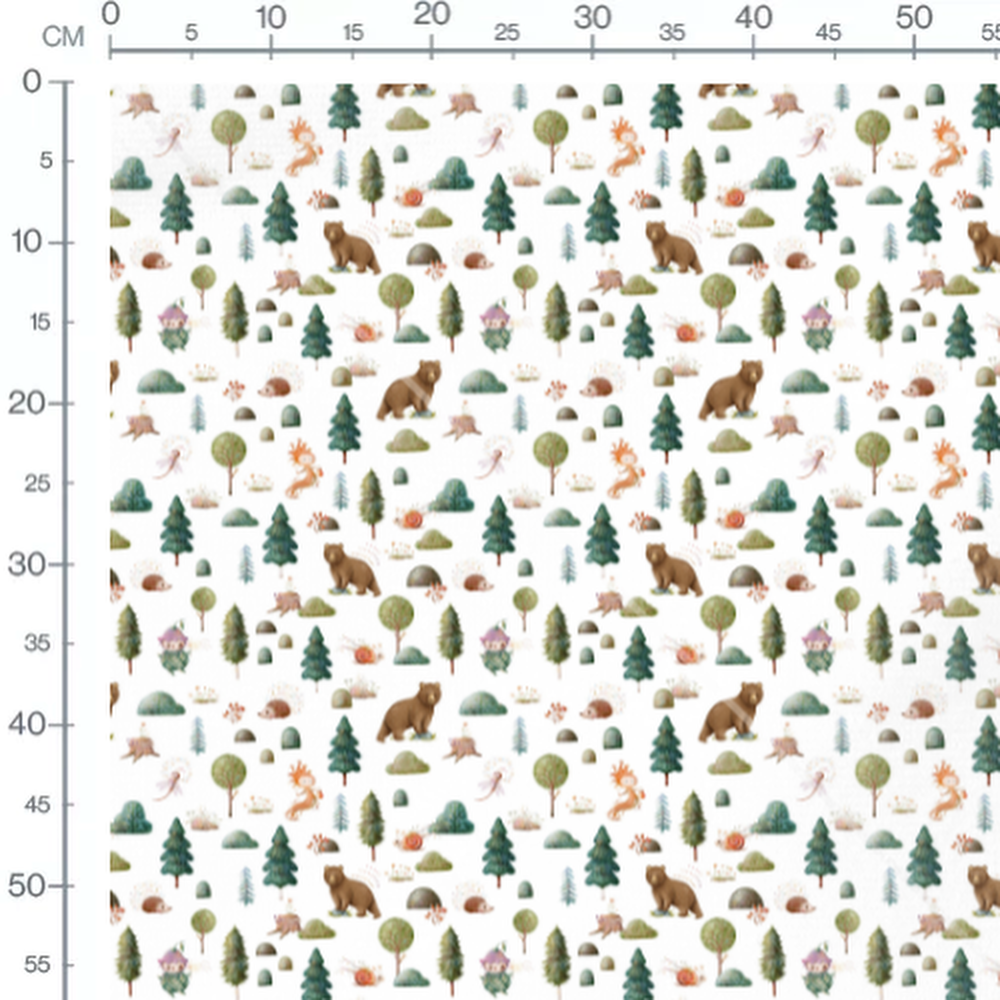 Les ours bruns se promènent parmi les arbres verts. Des hérissons et des escargots colorés ajoutent une touche de vie. Des créatures magiques flottent autour des arbres. Des rochers et des champignons complètent le paysage forestier.Les tissus