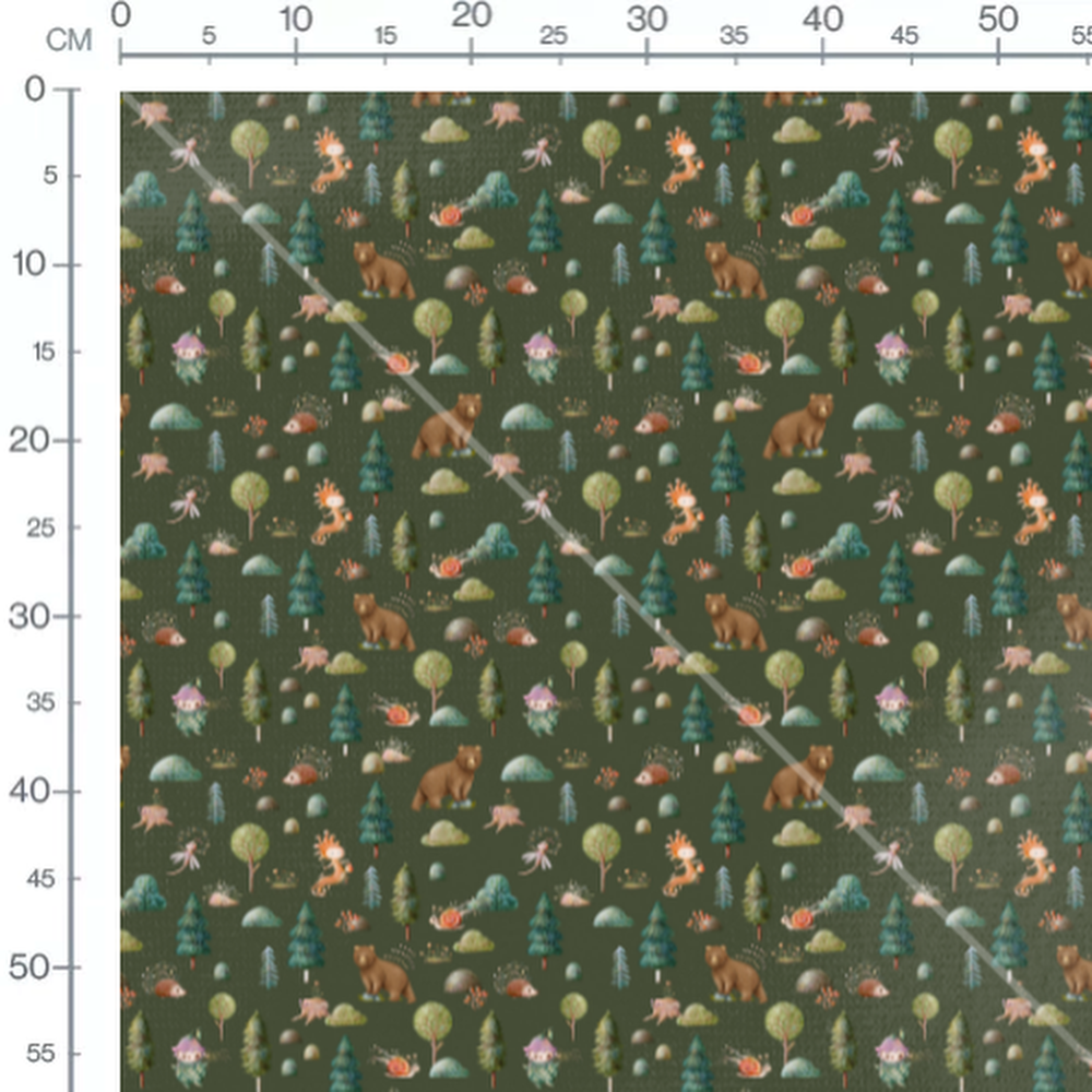 Des ours, hérissons et escargots côtoient des créatures magiques. Les arbres et les collines ajoutent une touche naturelle. Des champignons et des plantes complètent le décor forestier.Les tissus