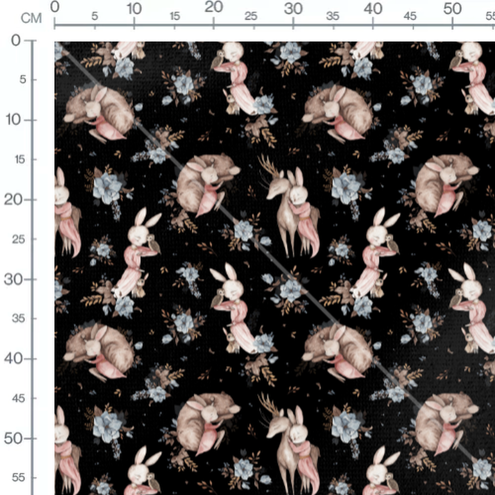 Les lapins portent des robes roses et tiennent des hiboux. Les ours sont allongés entourés de fleurs bleues et marron. Les cerfs arborent des bois élégants parmi les motifs floraux.Les tissus