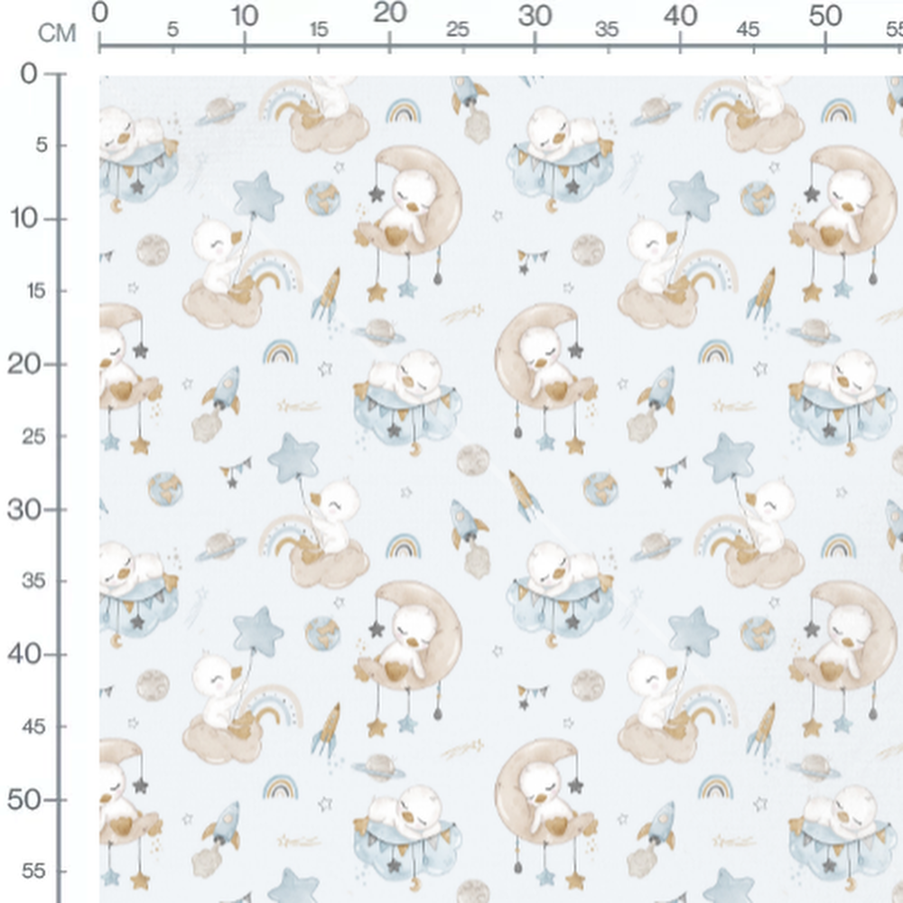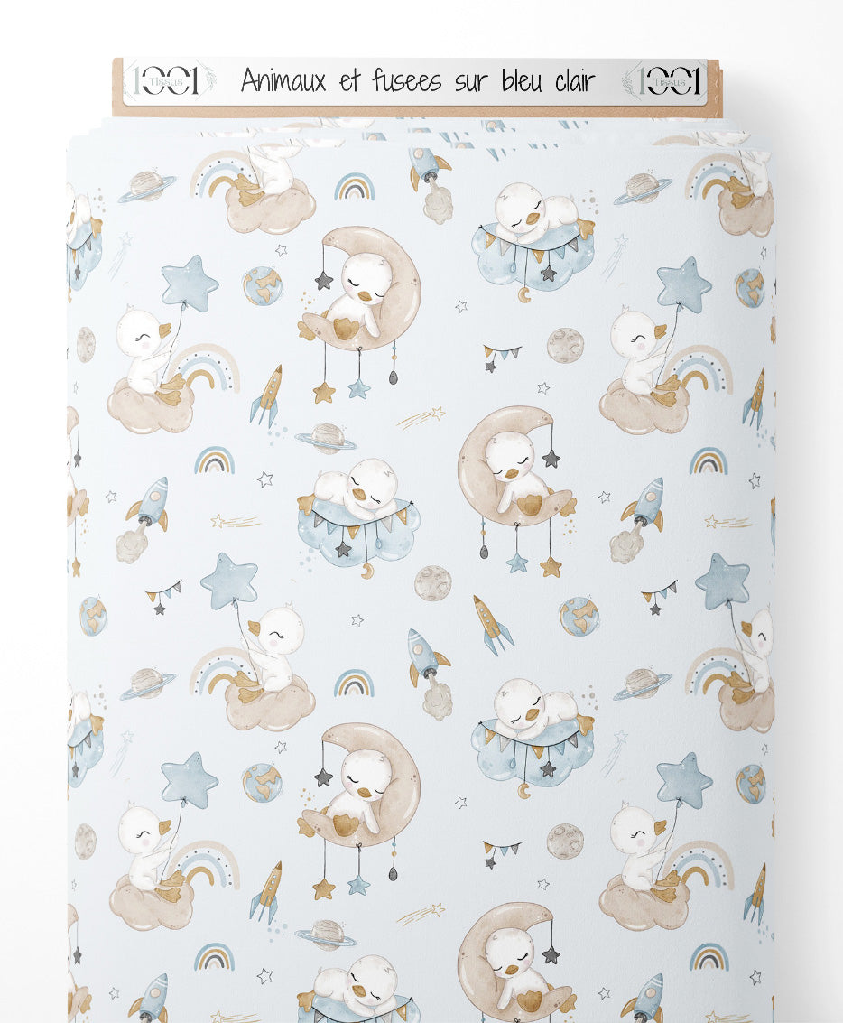 Les animaux sont entourés d'étoiles et de lunes suspendues. Des fusées et des planètes ajoutent une touche spatiale. Les arcs-en-ciel et les étoiles complètent le motif rêveur.Les tissus