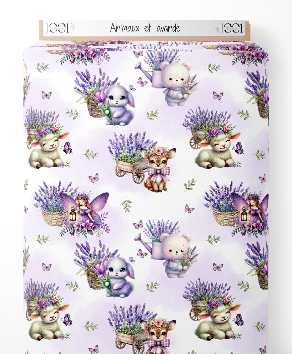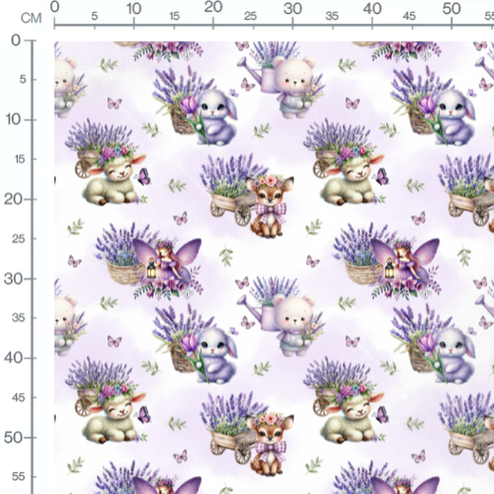Un lapin, un agneau et un faon entourés de lavande. Des paniers et des arrosoirs remplis de lavande. Une fée avec une lanterne parmi les fleurs.Les tissus