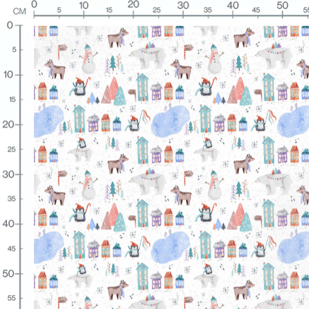 Bonhommes de neige avec écharpes et chapeaux sur fond blanc. Montagnes enneigées et flocons de neige dispersés sur fond blanc.Les tissus