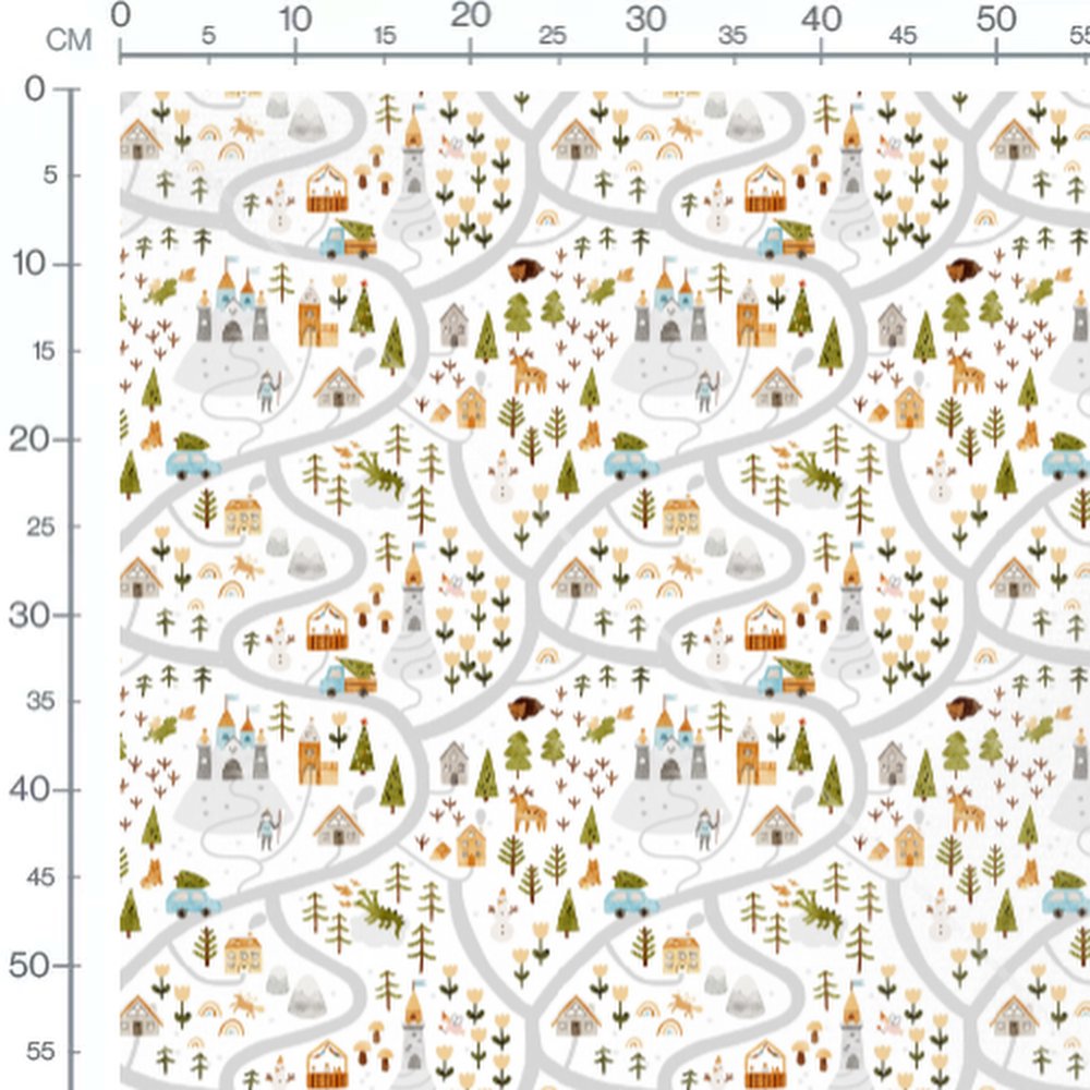 Petits animaux et voitures autour des châteaux. Montagnes et fleurs dispersées dans le paysage. Arbres verts et marron ajoutant une touche naturelle.Les tissus