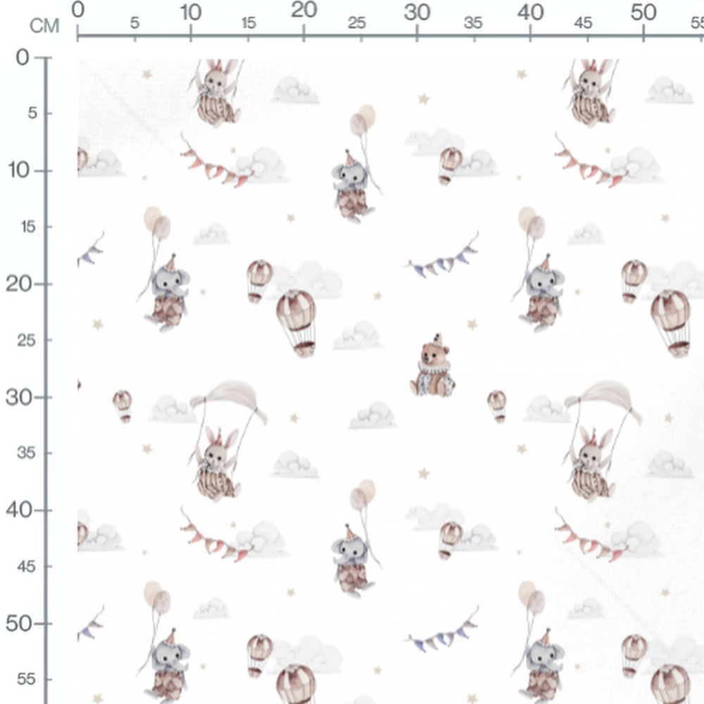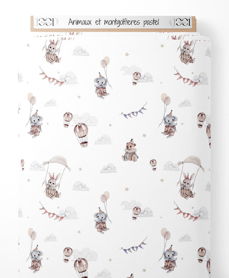 Les animaux portent des chapeaux de fête et tiennent des ballons. Les montgolfières sont de couleur beige et marron. De petits nuages blancs et gris ajoutent une touche aérienne. Des guirlandes colorées complètent le motif festif.Les tissus