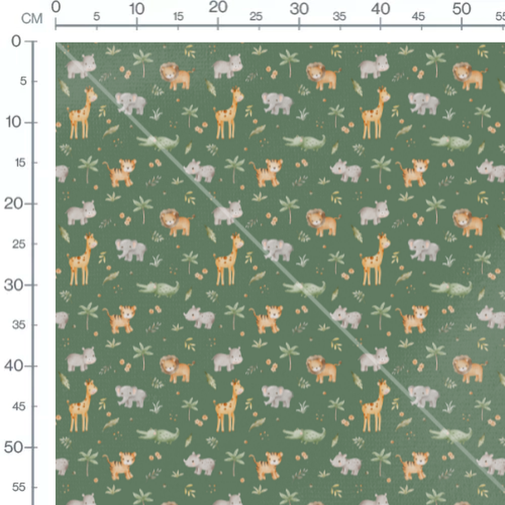 Les animaux incluent des girafes, des éléphants, des lions, des tigres et des hippopotames. Des palmiers et des feuilles complètent le motif sur un fond vert.Les tissus
