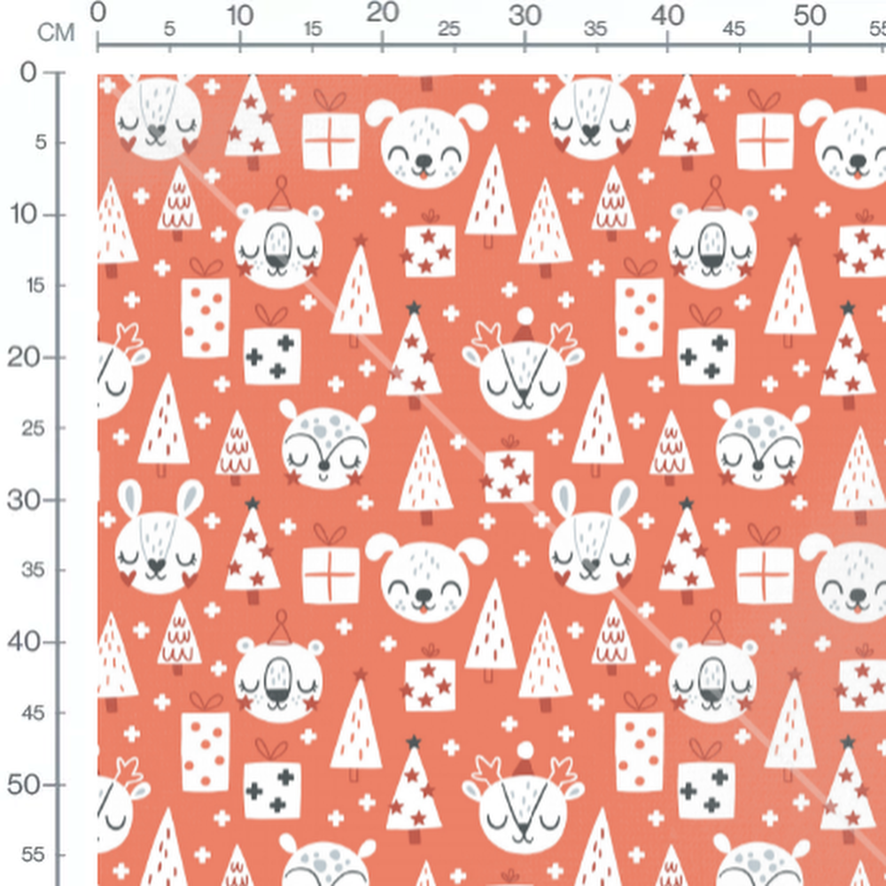 Les animaux ont des expressions joyeuses et portent des accessoires festifs. Les sapins sont décorés de petites étoiles rouges. Les cadeaux sont ornés de motifs géométriques simples. Des croix blanches ajoutent un élément graphique au fond rouge.Les tissus