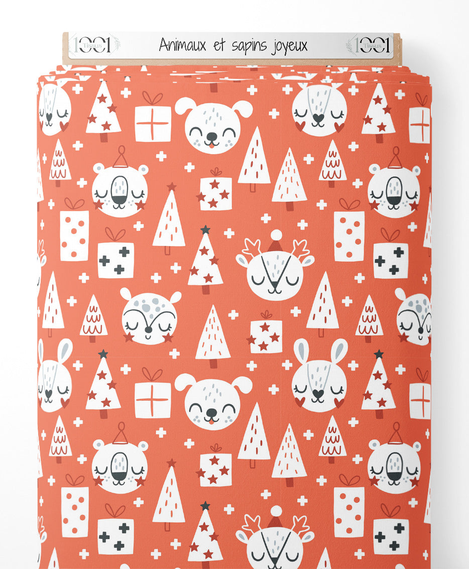 Tissu - Animaux et sapins joyeux