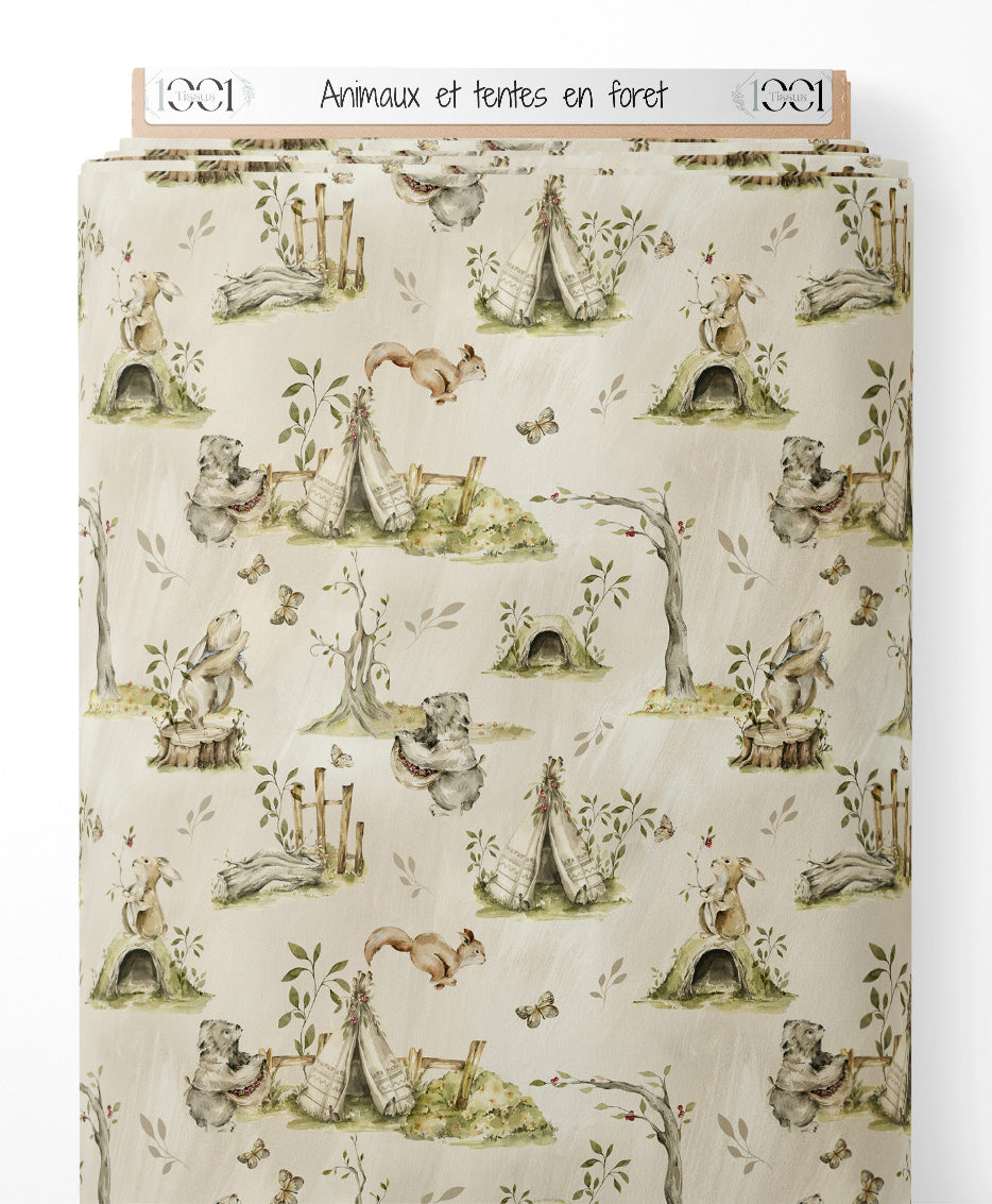 Les animaux sont entourés de petites tentes et de végétation. Des papillons volent autour des arbres et des animaux. Les couleurs sont douces et naturelles, avec des nuances de beige, vert et brun.Les tissus