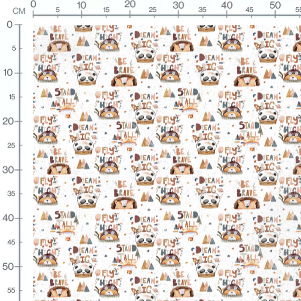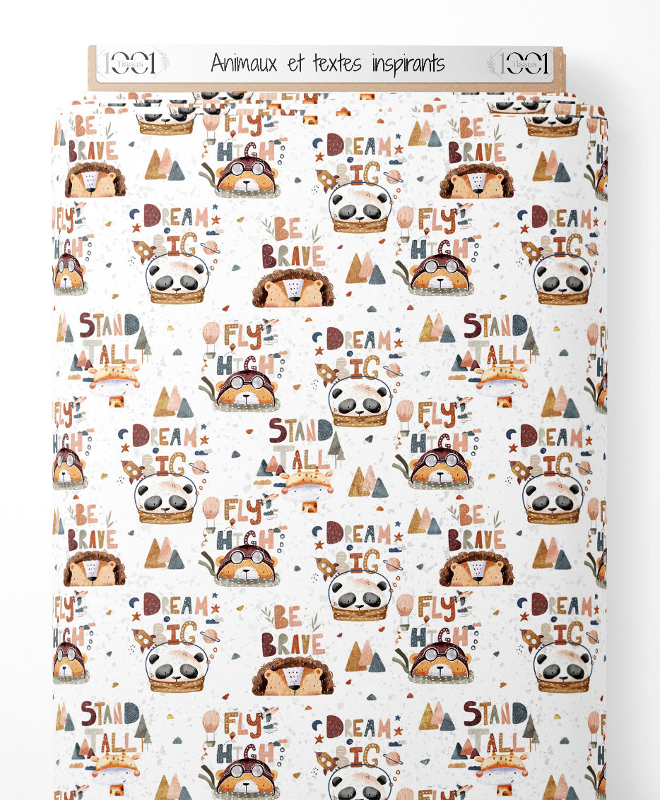 Les animaux portent des lunettes et sont entourés de mots inspirants comme 'Be Brave' et 'Dream Big'. Les couleurs dominantes sont le marron, l'orange et le gris. Des motifs géométriques comme des triangles et des arbres complètent le design.Les tissus