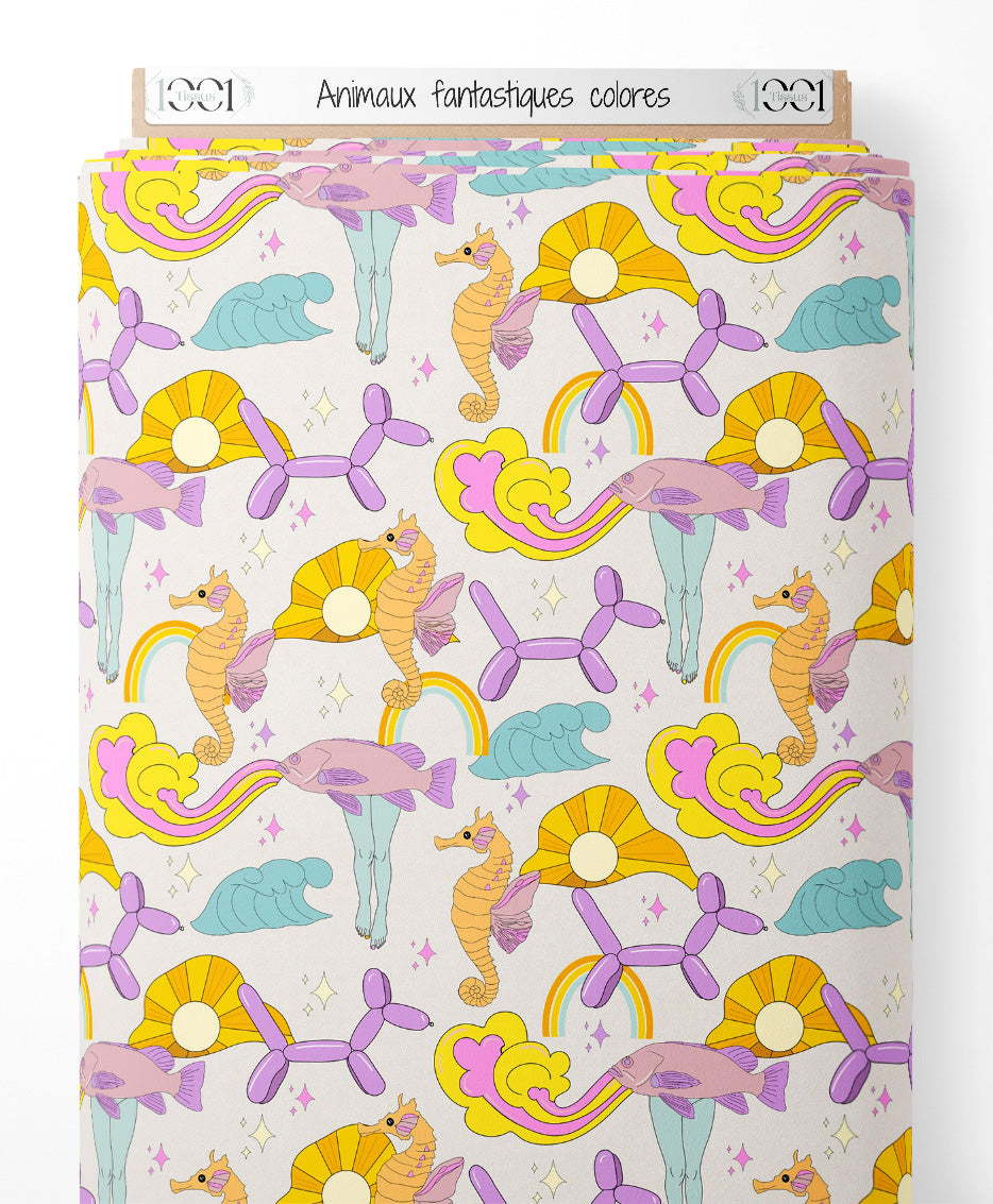 Ballons en forme de chien violets et soleils jaunes. Nuages roses et jaunes avec des étoiles scintillantes. Poissons avec jambes humaines et hippocampes aux ailes violettes.Les tissus