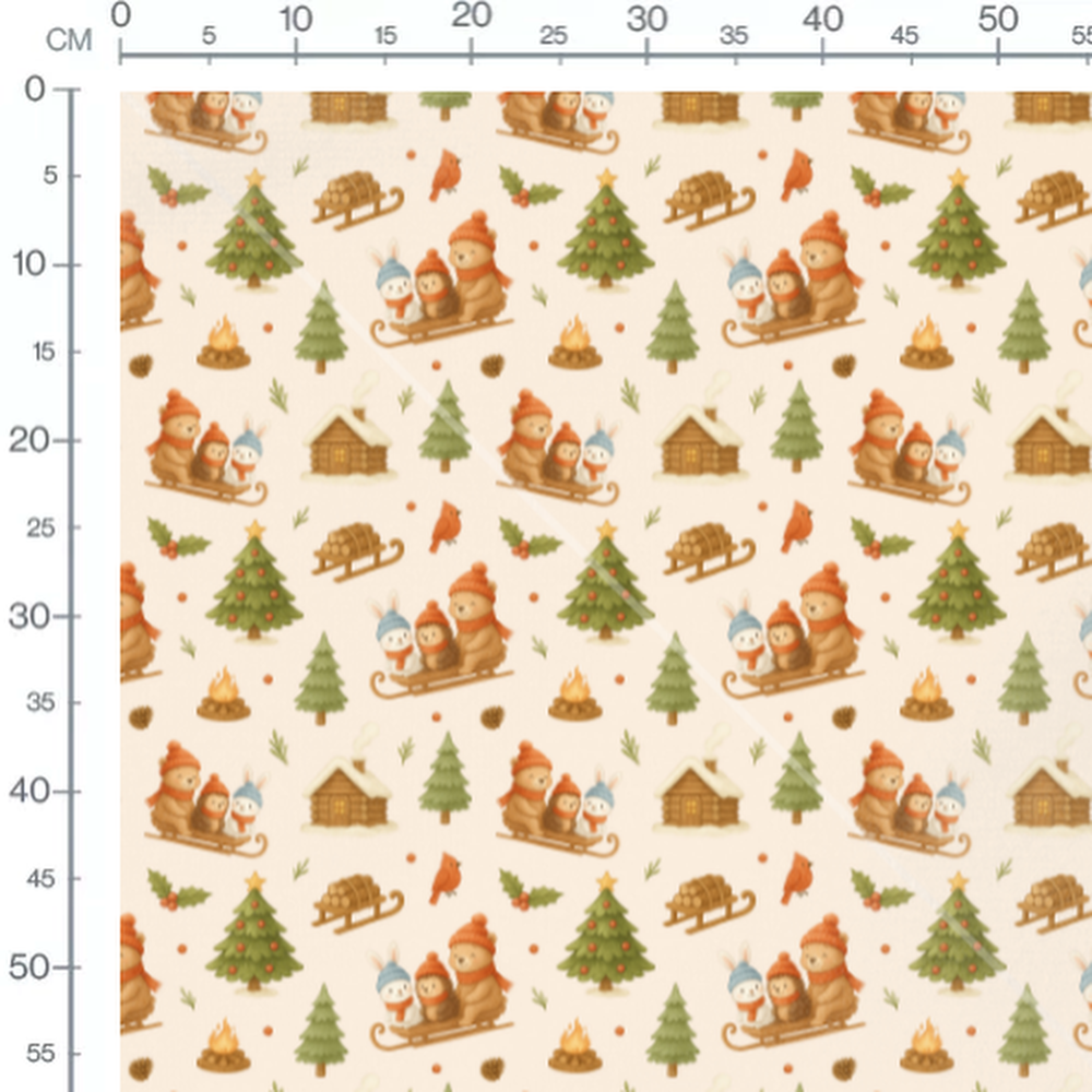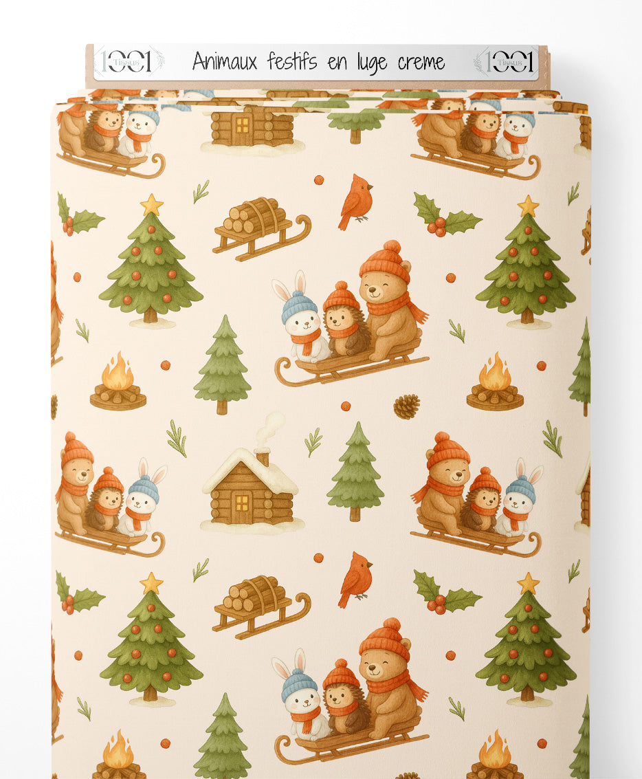 Un renard, un ours et un lapin portent des bonnets et des écharpes colorés. Des sapins verts et des cabanes en bois complètent le motif festif. Un feu de camp et des branches de houx ajoutent des touches de chaleur. Un cardinal rouge et des pommes de pin sont dispersés sur le fond.Les tissus