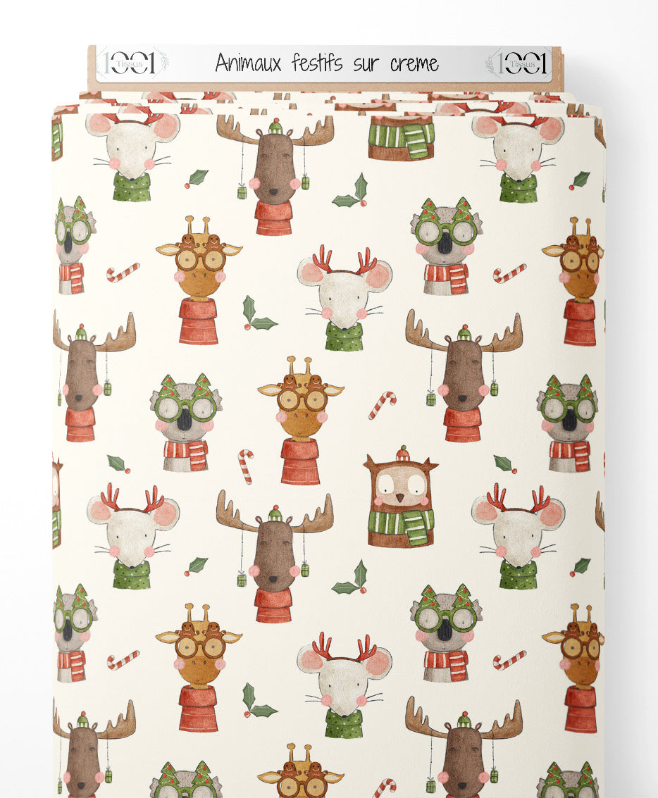 Les animaux portent des accessoires festifs comme des bonnets et des écharpes. Les motifs incluent des rennes, des souris, des koalas et des girafes. Les couleurs dominantes sont le rouge, le vert et le marron.Les tissus