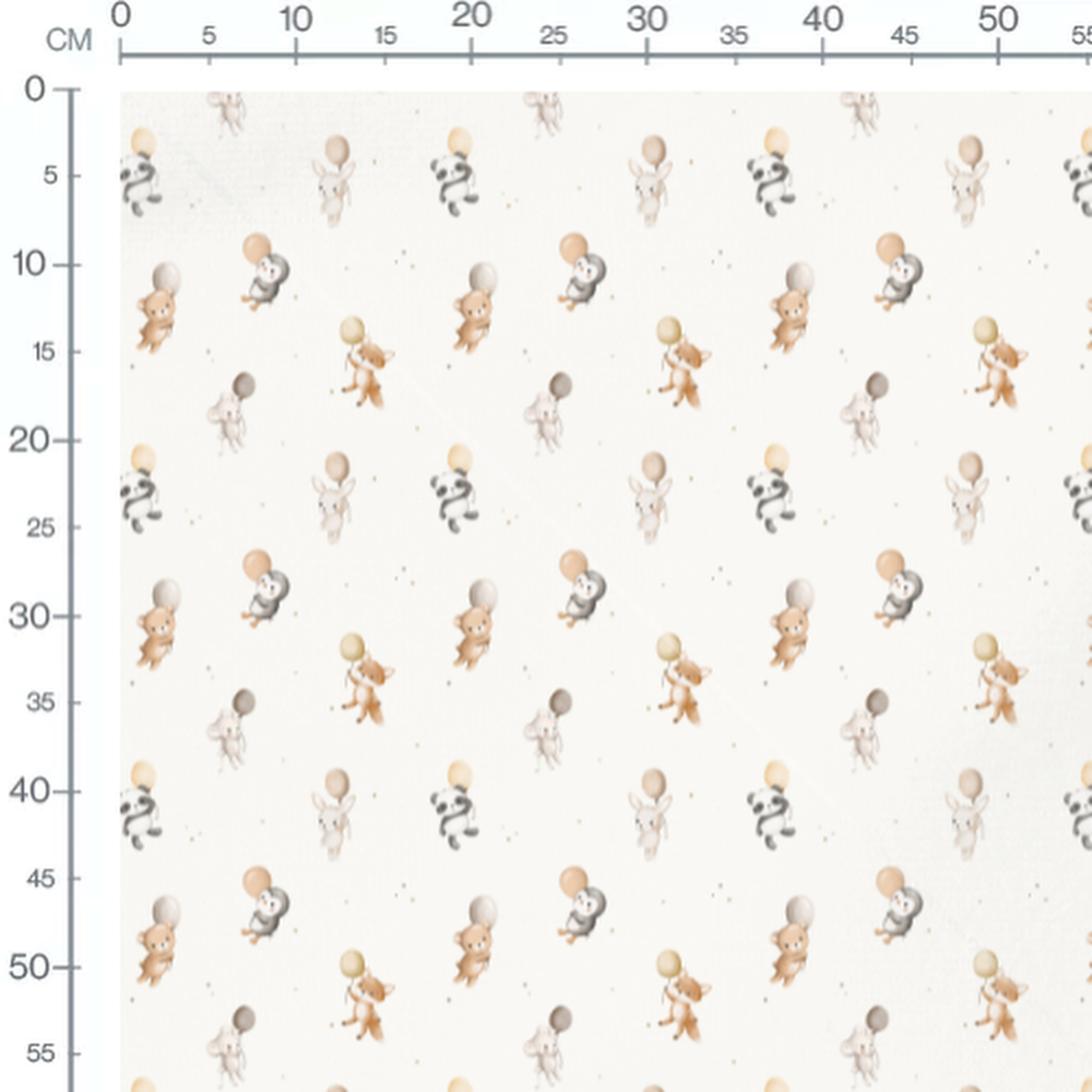 Les animaux incluent un panda, un renard, un ours, un pingouin et une souris. Chaque animal tient un ballon de couleur pastel. Le fond est blanc avec de petites touches de couleur dispersées.Les tissus