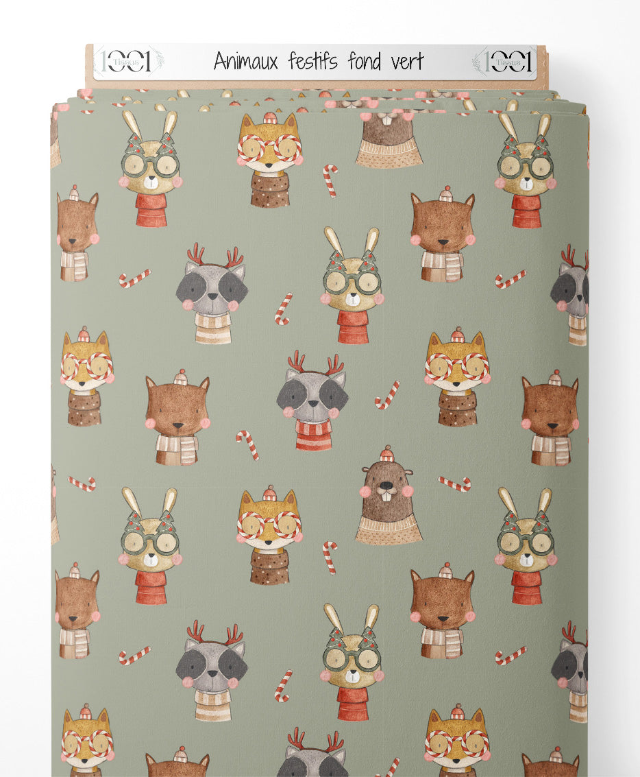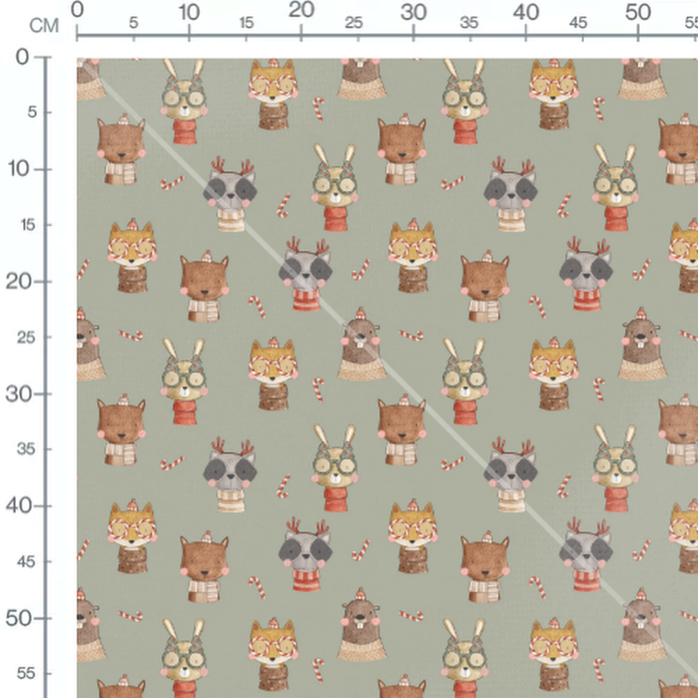 Les animaux portent des lunettes et des accessoires d'hiver. Les bonnets et écharpes sont de couleurs variées. Les cannes de Noël ajoutent une touche festive au motif.Les tissus