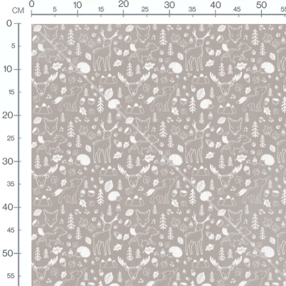 Les animaux incluent des cerfs, des renards et des hérissons. Des empreintes de pattes et des champignons ajoutent des détails. Le fond gris met en valeur les silhouettes blanches des motifs.Les tissus