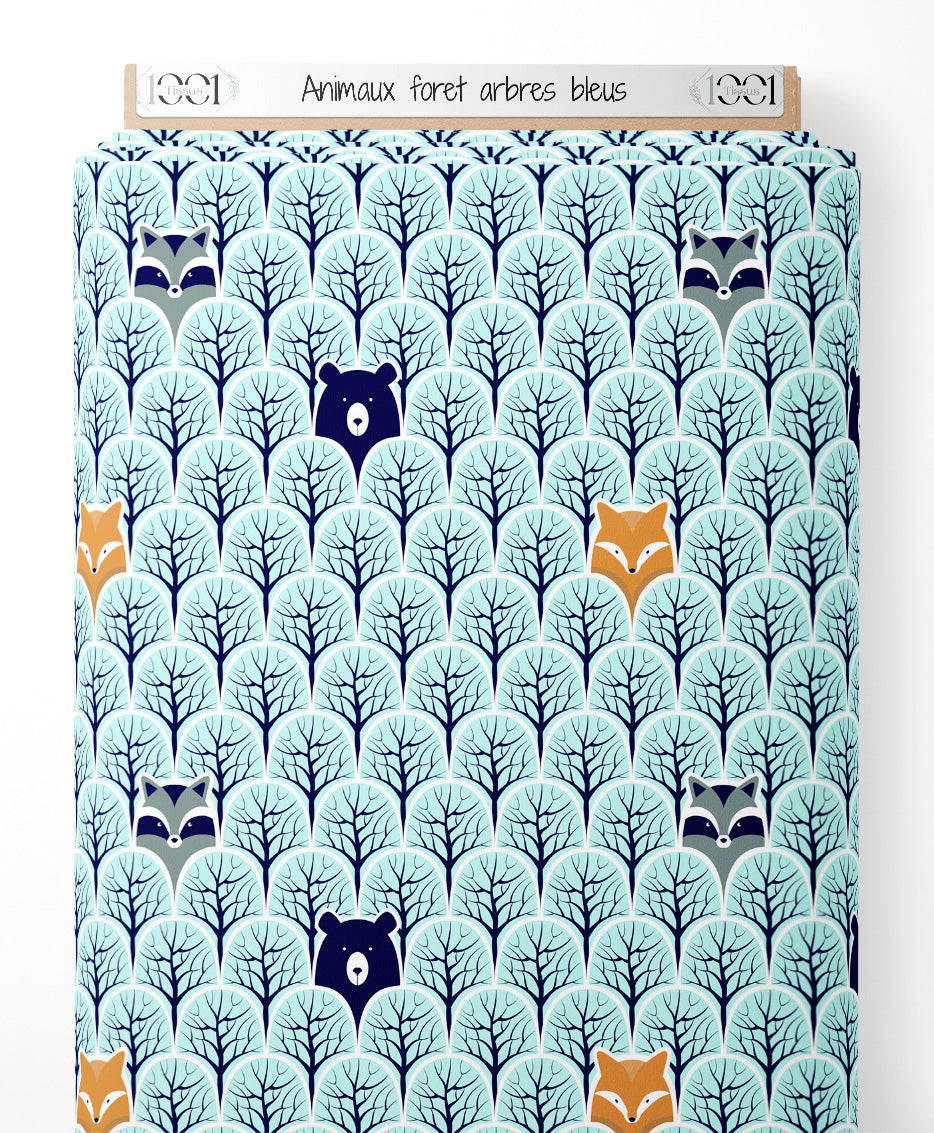 Les animaux sont entourés d'arbres stylisés avec des branches noires. Le fond bleu clair met en valeur les silhouettes des animaux et des arbres. Les couleurs contrastées ajoutent une touche de fantaisie au motif.Les tissus