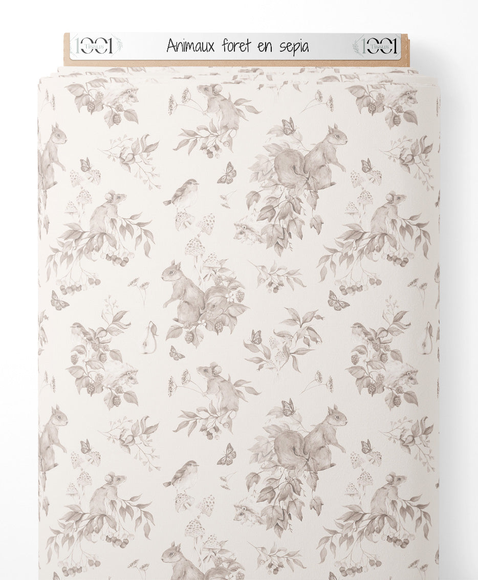 Hérissons et souris en sépia parmi des branches. Baies et fleurs délicates en tons sépia. Papillons et oiseaux ajoutent une touche de nature douce.Les tissus