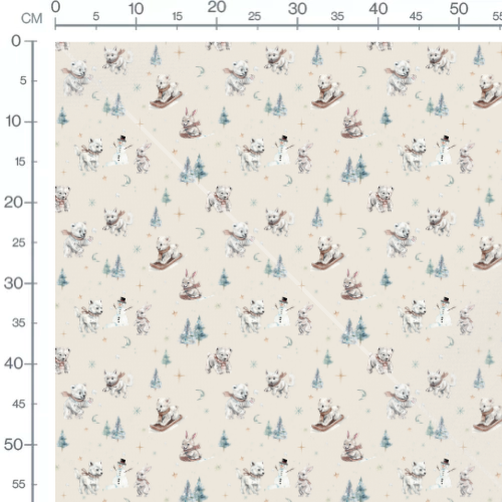 Les ours jouent dans la neige avec des écharpes. Les renards et lapins glissent joyeusement. Des sapins enneigés et un bonhomme de neige complètent le décor hivernal.Les tissus