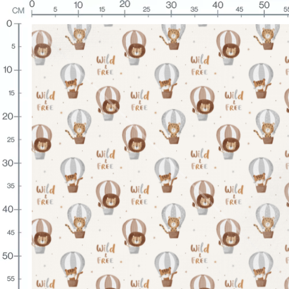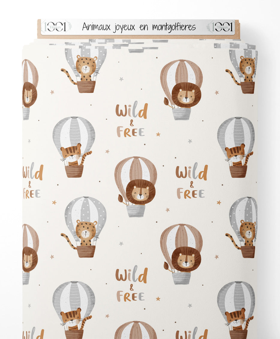 Les montgolfières sont décorées de rayures et abritent des animaux souriants. Le texte 'Wild & Free' ajoute une touche d'aventure. De petites étoiles grises et marron parsèment le fond.Les tissus