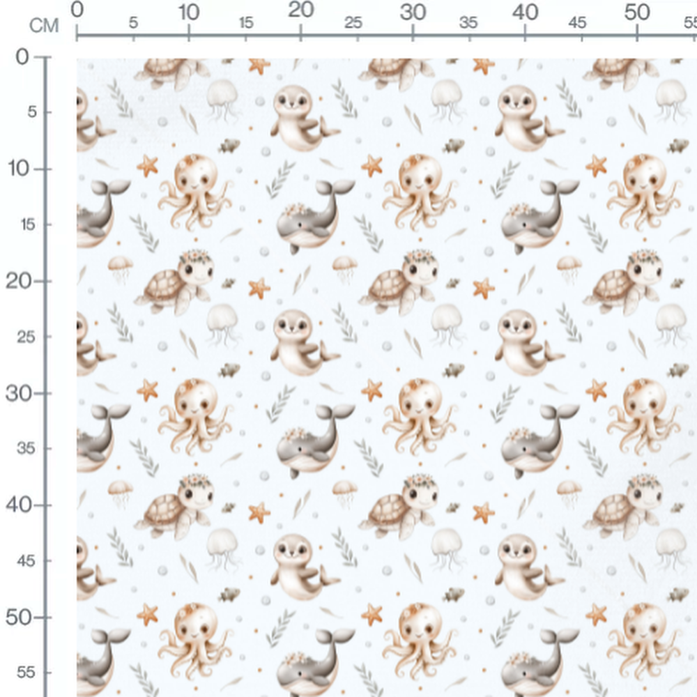Petits poissons et méduses flottant autour des animaux. Tortues et phoques souriants parmi les bulles. L'ensemble est agrémenté de touches de beige et de gris.Les tissus