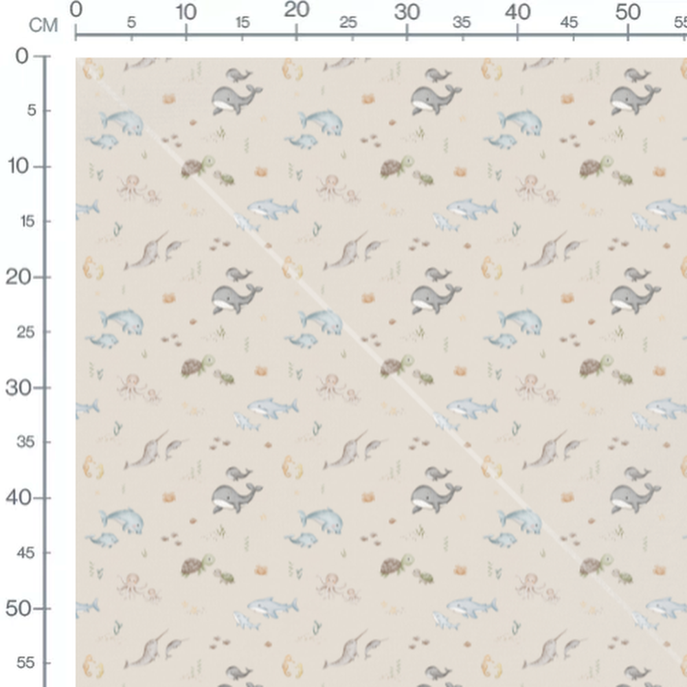 Narvals et requins ajoutent une touche unique au design. Petites étoiles de mer et algues parsèment le fond. Les couleurs douces créent une ambiance apaisante.Les tissus