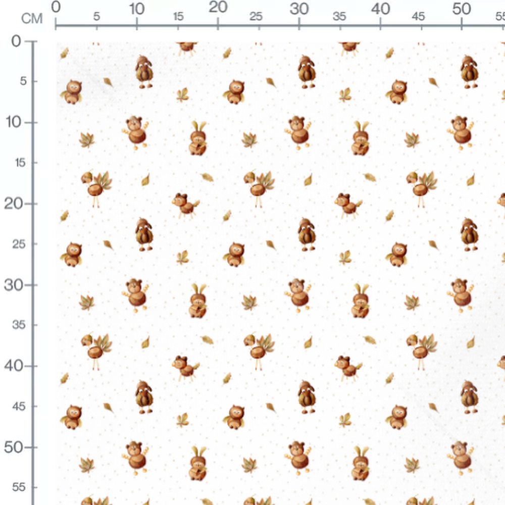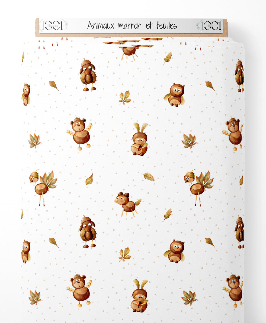 Les animaux incluent un hibou, un hérisson, un ours et un lapin. Les feuilles sont de couleur automnale, ajoutant une touche de saison. Les petits points beige créent un motif subtil sur le fond blanc.Les tissus