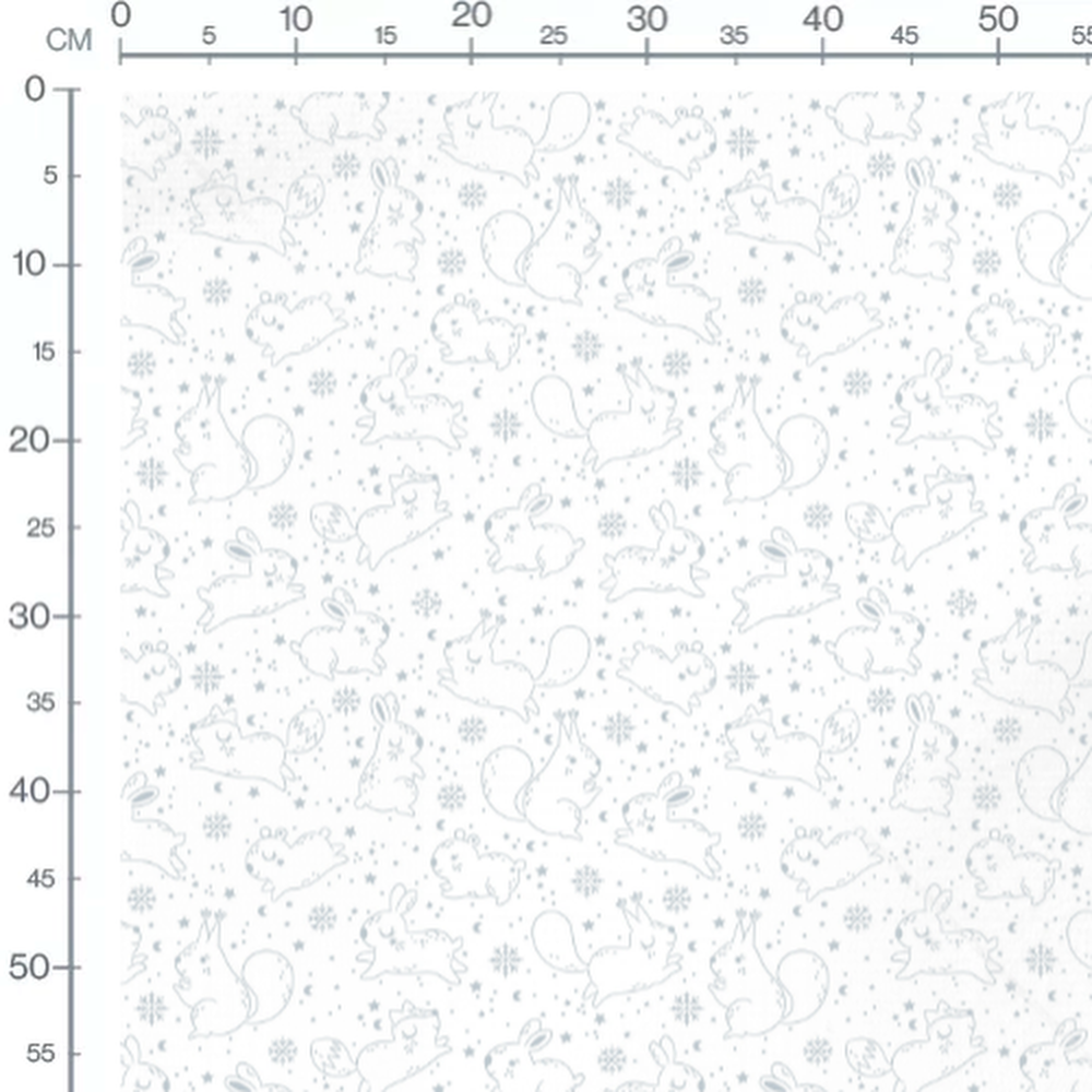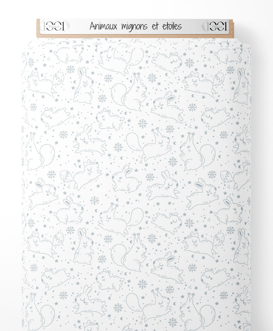 Les animaux incluent des lapins, des renards et des écureuils. Les motifs sont entourés de petites étoiles et de lunes grises. Le style est simple et épuré, avec des contours fins.Les tissus