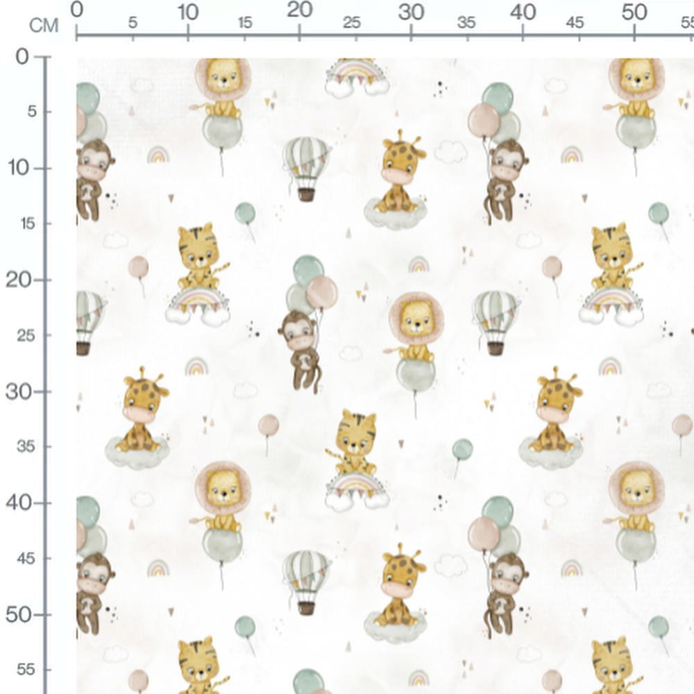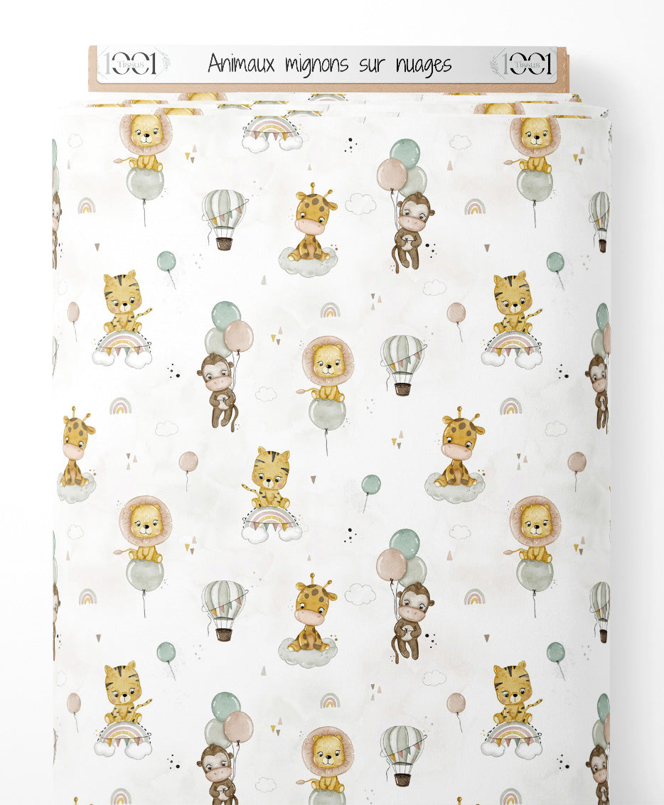 Les animaux incluent des lions, des girafes et des singes. Les ballons sont dans des tons pastel de rose, bleu et beige. Les nuages sont blancs et doux, ajoutant une touche aérienne. Les arcs-en-ciel sont délicats et colorés subtilement. Les montgolfières ajoutent une dimension d'aventure au motif.Les tissus