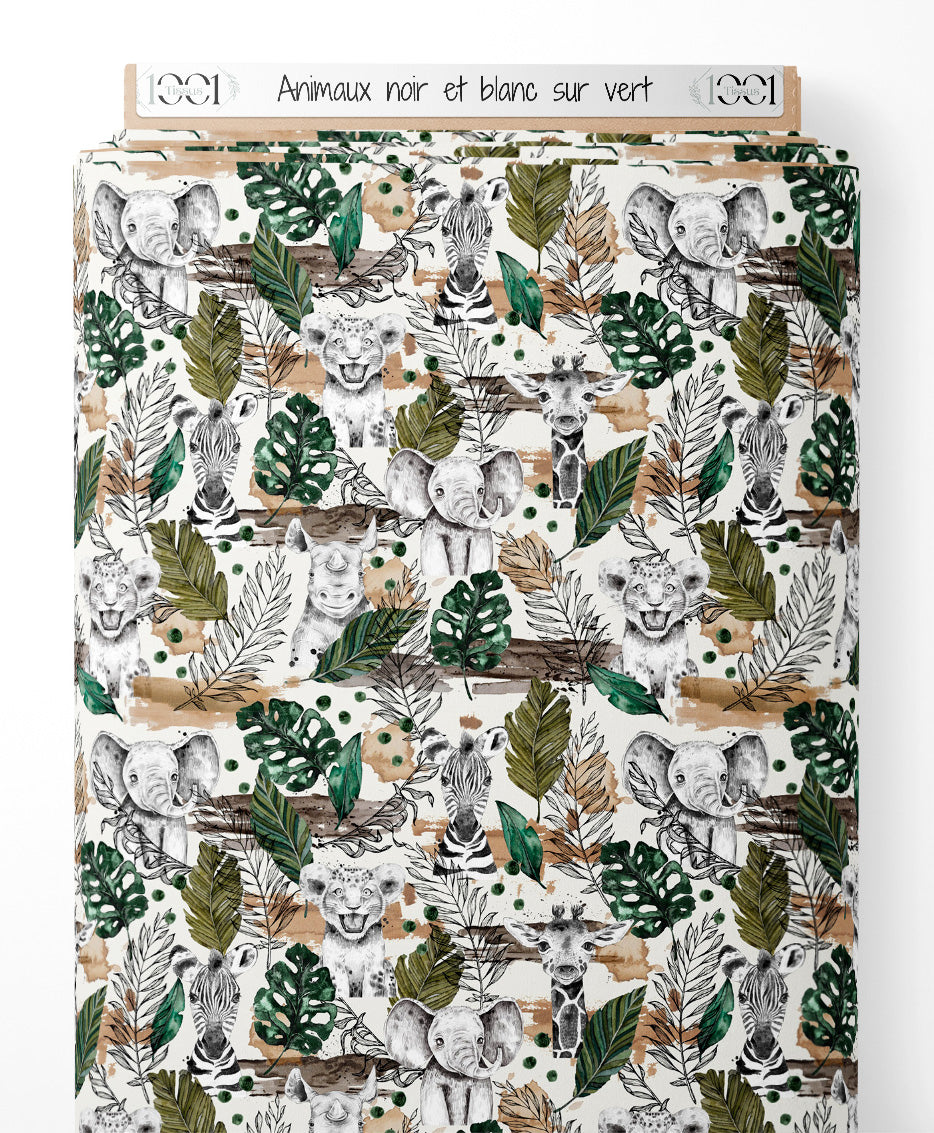 Les éléphants, zèbres et girafes sont dessinés en noir et blanc, entourés de feuilles vertes. Des rhinocéros et lions se mêlent au motif, ajoutant des nuances de brun. Les feuilles vertes apportent une touche de nature à l'ensemble.Les tissus