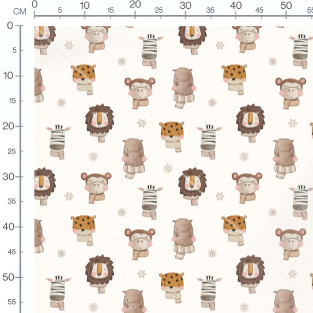 Les animaux portent des écharpes beige et grise. Les motifs incluent des flocons de neige gris clair. Les animaux ont des expressions adorables et sont dessinés dans un style doux et enfantin.Les tissus