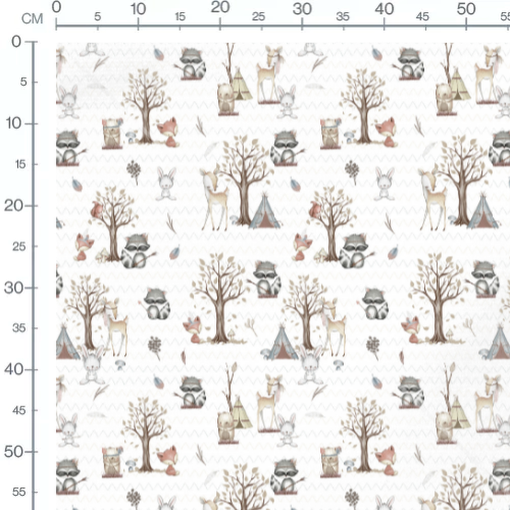 Des renards, ratons laveurs et cerfs se mêlent aux arbres. Tipis et lapins ajoutent une touche ludique. Feuilles et plumes accentuent le thème forestier.Les tissus