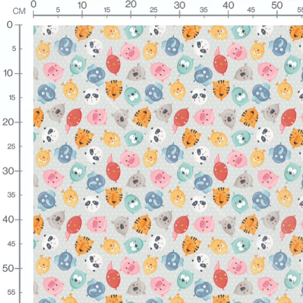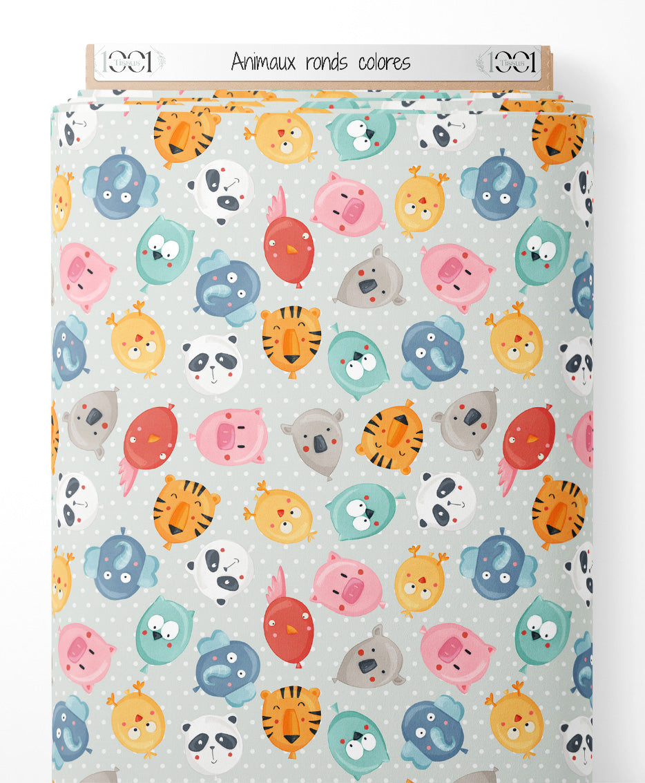 Les animaux incluent des tigres orange, des pandas noirs et blancs, et des éléphants bleus. Les cochons sont roses et les oiseaux rouges et jaunes. Le fond est gris clair avec des pois blancs discrets.Les tissus