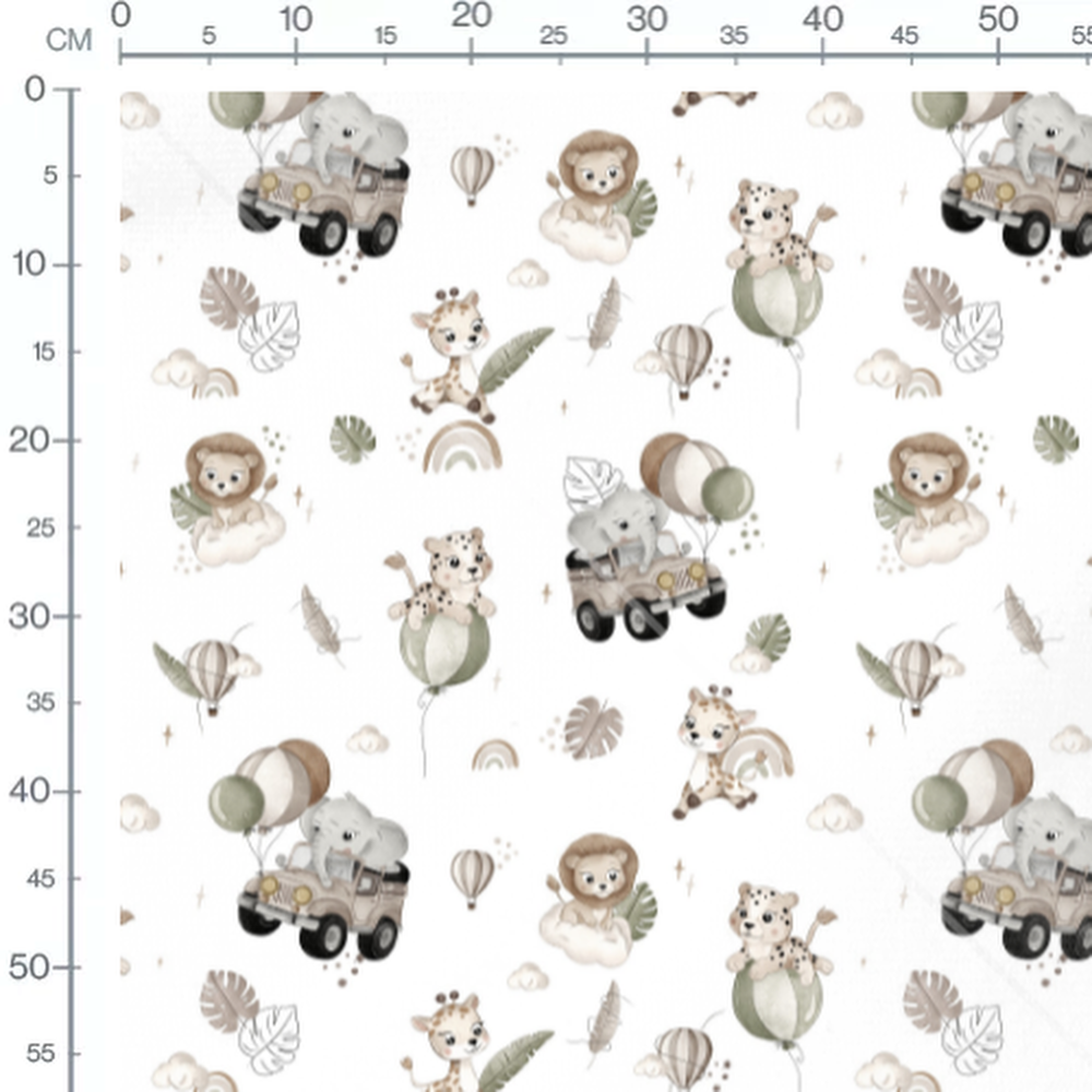 Les éléphants conduisent des jeeps grises. Les lions sont assis sur des nuages blancs. Les girafes et léopards flottent avec des ballons verts.Les tissus