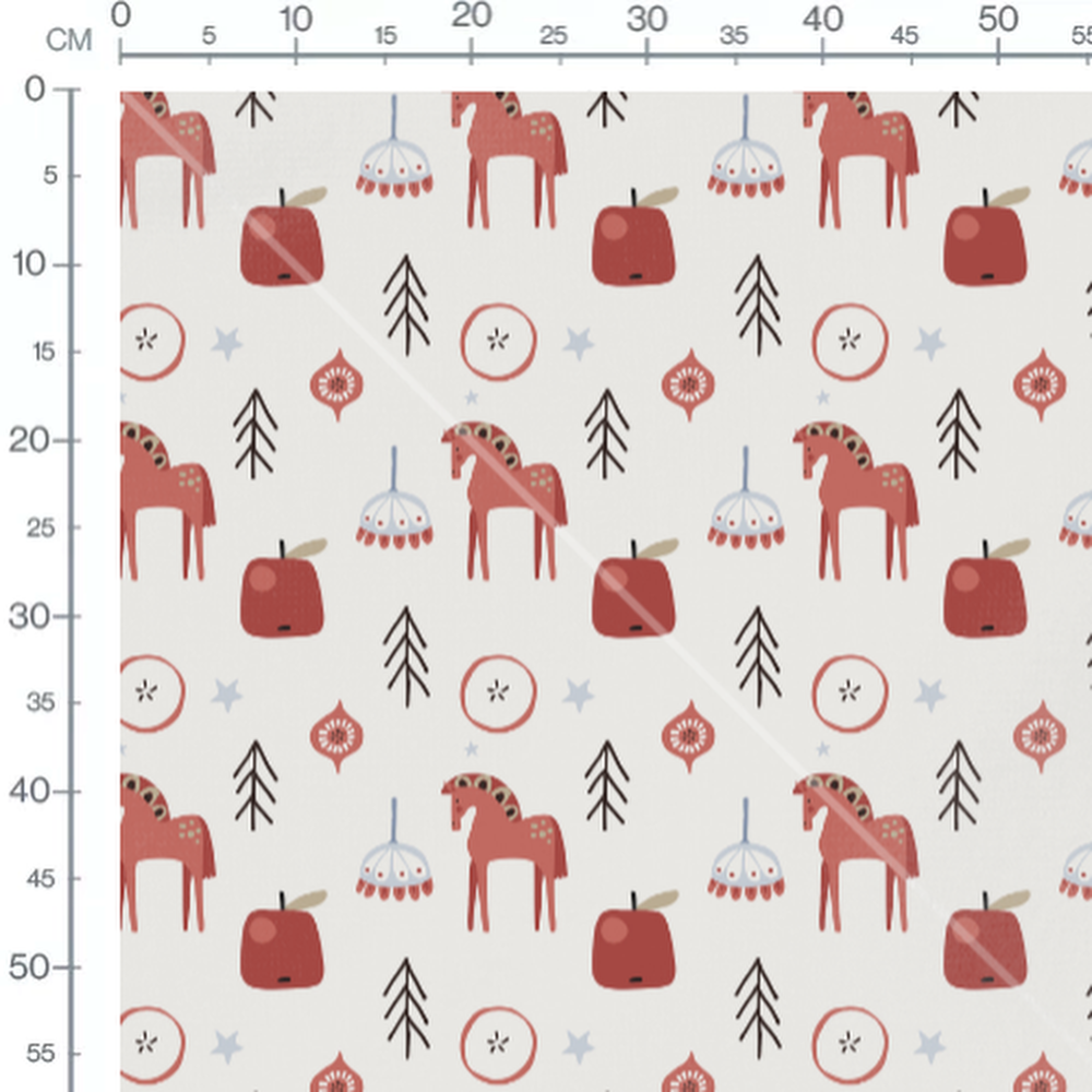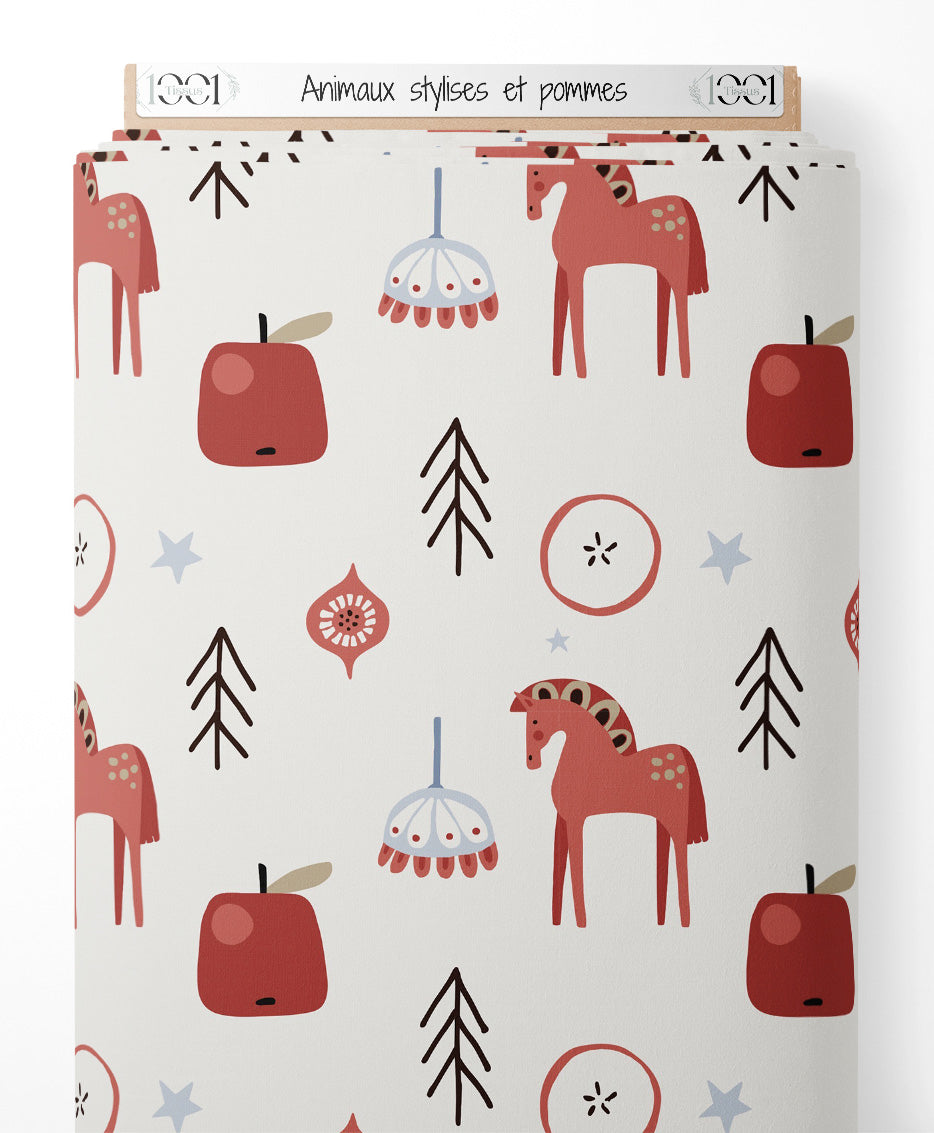 Les pommes rouges sont accompagnées de motifs d'animaux stylisés. Des étoiles bleues et des arbres noirs complètent le design. Des éléments décoratifs rouges ajoutent une touche de couleur.Les tissus