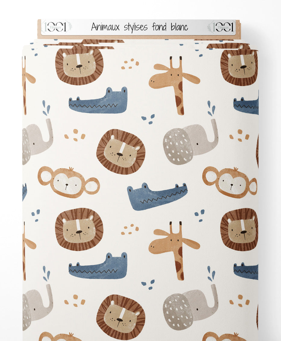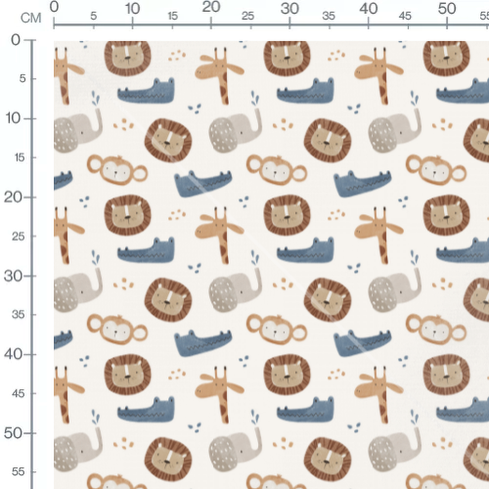 Les lions ont une crinière marron et un visage beige. Les crocodiles sont bleus avec des détails simples. Les éléphants sont gris avec des oreilles tachetées. Les singes sont marron clair avec un visage blanc. Les girafes ont des taches marron sur un corps beige.Les tissus