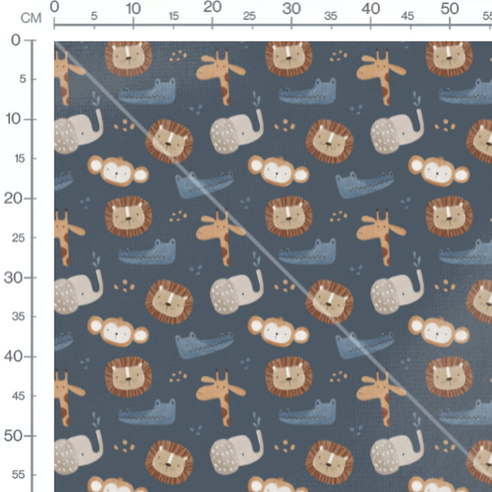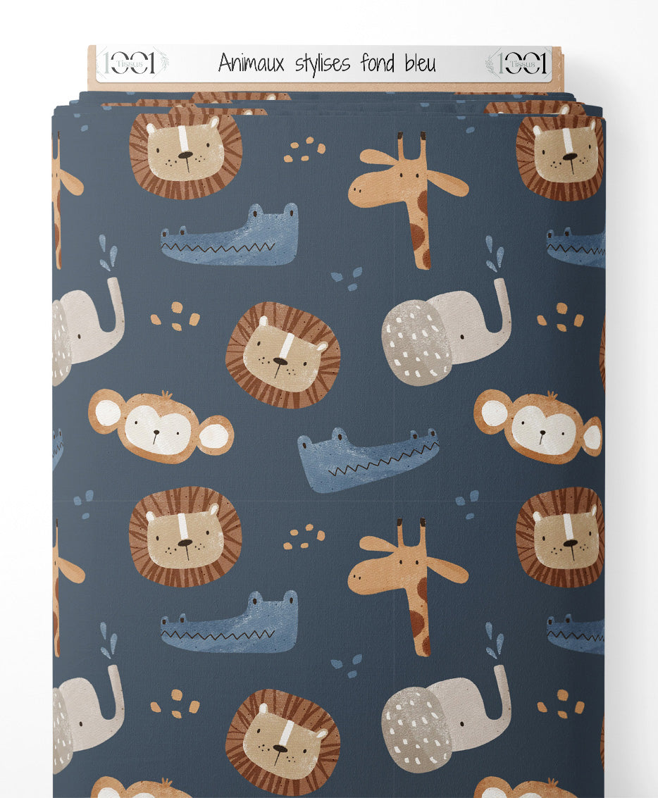 Les lions ont une crinière brune et un visage beige. Les éléphants sont gris avec des oreilles blanches. Les girafes sont marron clair avec des taches foncées. Les crocodiles sont bleus avec des détails blancs. Les singes sont beiges avec des oreilles blanches.Les tissus