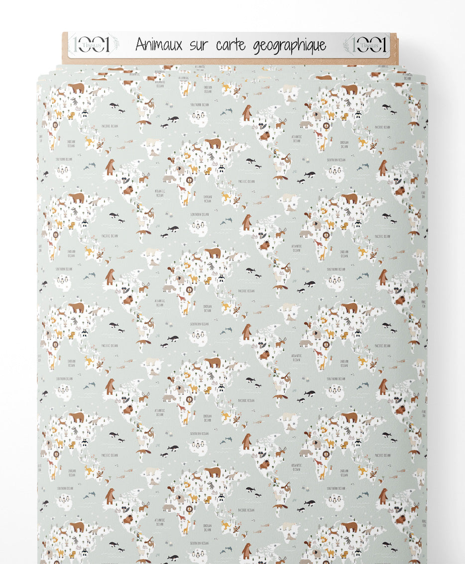 Les continents sont remplis de silhouettes d'animaux comme des ours, des éléphants et des baleines. Les océans sont nommés et le fond est d'un gris clair uniforme. Chaque continent présente des animaux typiques de sa région. Les illustrations sont simples et colorées, ajoutant une touche éducative.Les tissus