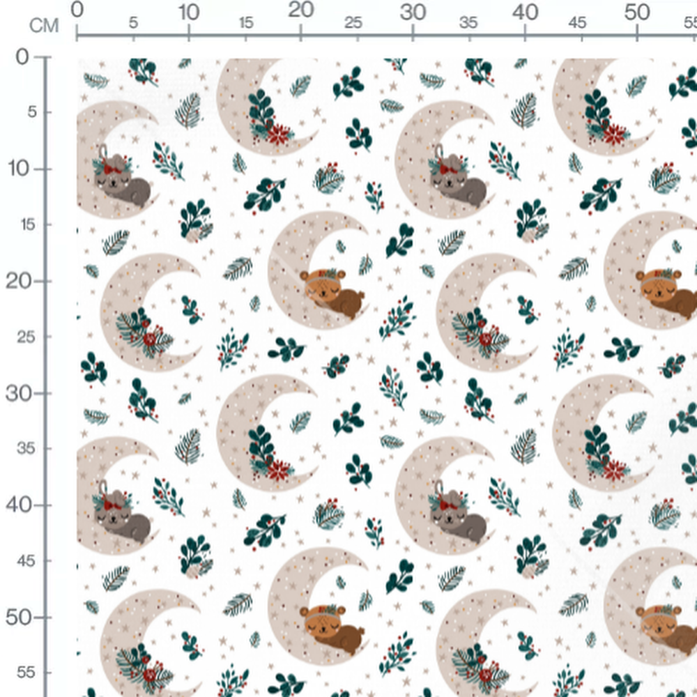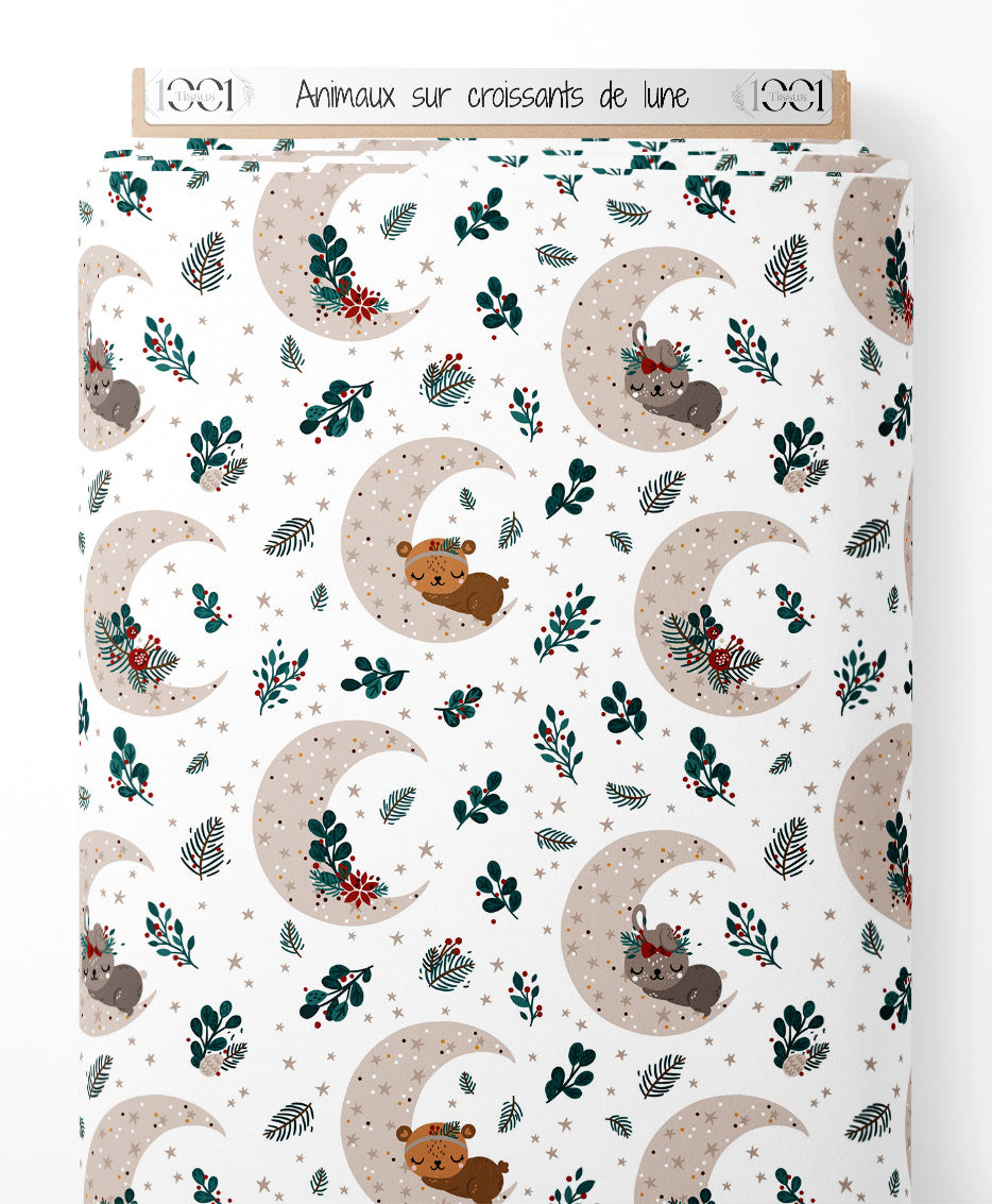 Les croissants de lune sont parsemés d'étoiles grises. Les animaux incluent un lapin et un ours endormis. Des motifs de feuillages et de petites baies rouges complètent le design.Les tissus