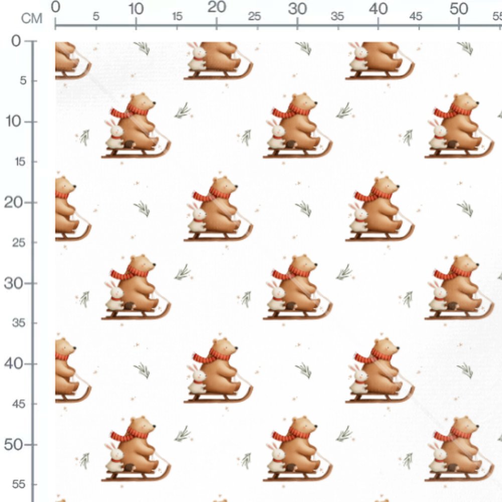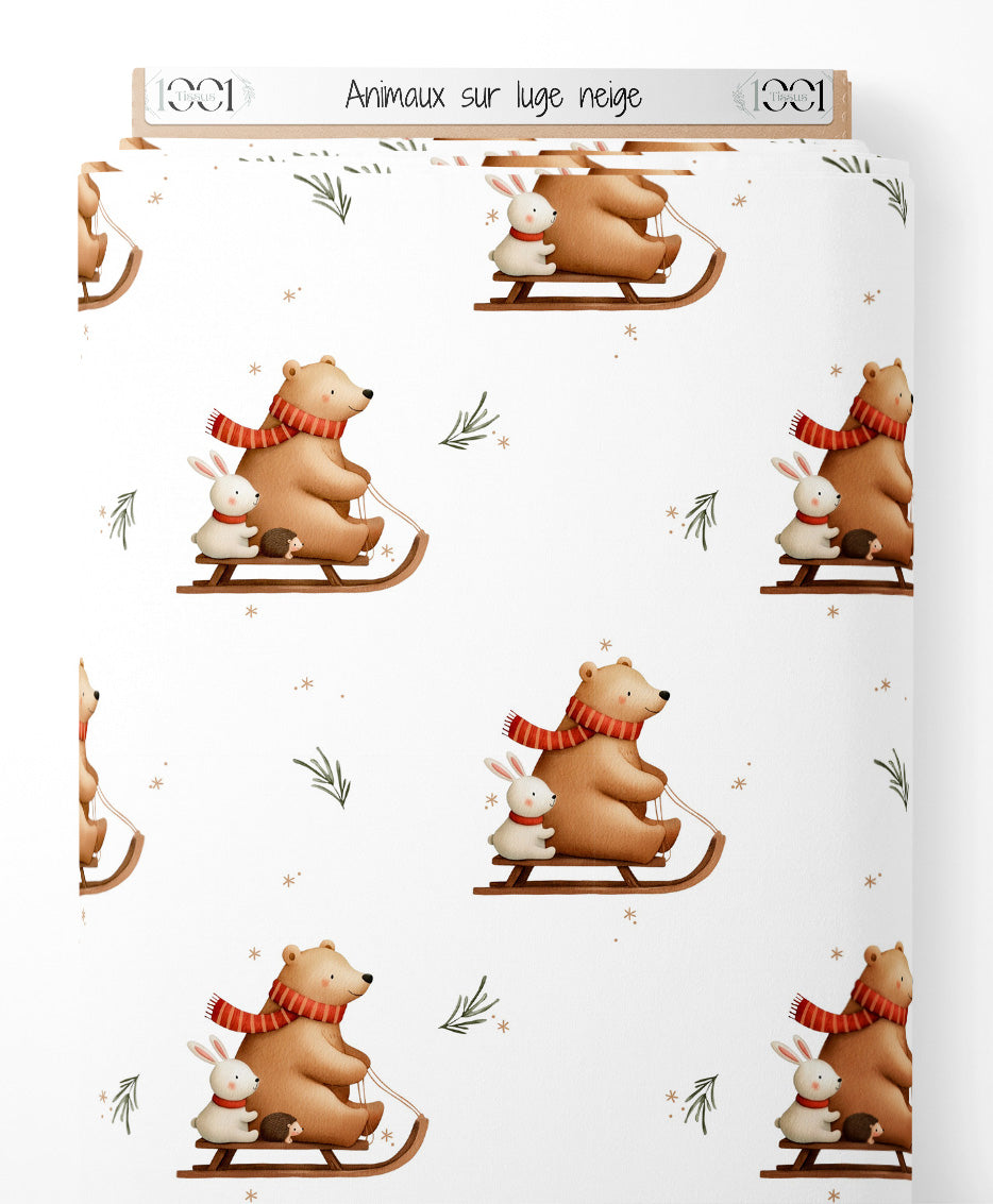 Les animaux portent des écharpes rouges. De petites branches vertes et des flocons de neige complètent le motif hivernal.Les tissus