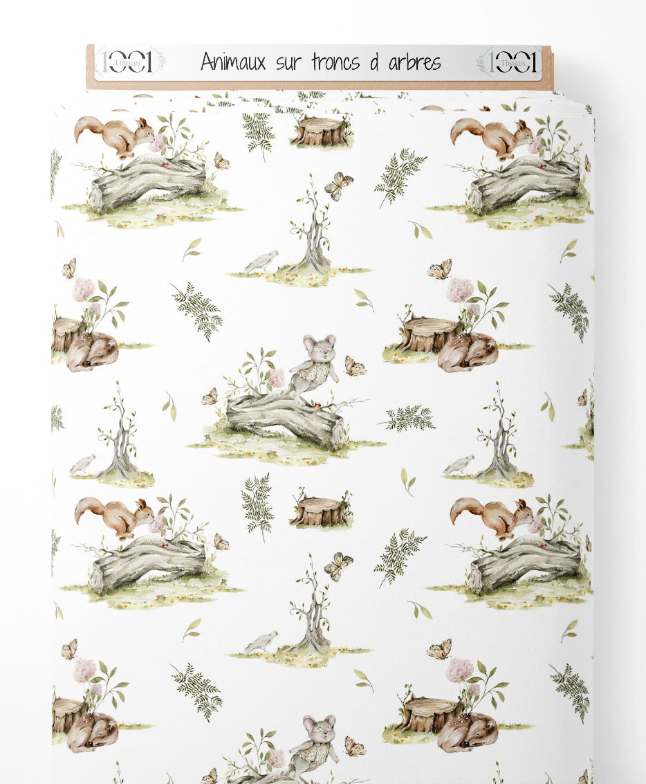 Les troncs d'arbres sont entourés de petites fleurs roses et de papillons délicats. Des feuilles vertes parsèment le fond blanc, ajoutant une touche naturelle. Un écureuil et une souris sont posés sur les troncs, créant une scène de forêt paisible.Les tissus