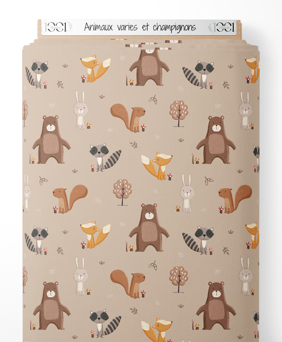 Les ours sont marron avec des détails blancs. Les renards sont orange avec des queues blanches. Les lapins sont blancs avec des oreilles longues. Les ratons laveurs ont des masques noirs et des queues rayées. Les écureuils sont marron clair avec des queues touffues.Les tissus