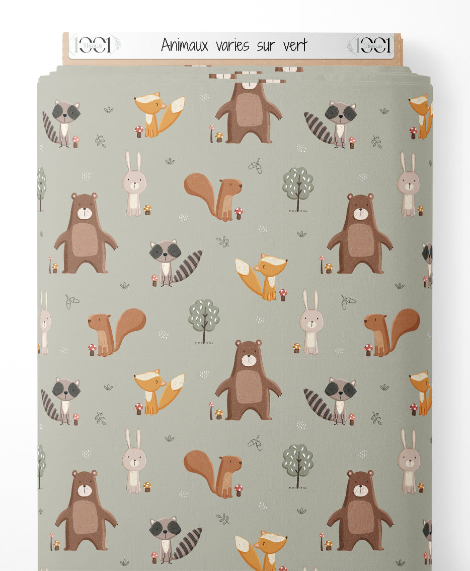 Les renards sont orange avec des détails blancs. Les ours sont bruns et les ratons laveurs ont des masques noirs. Les lapins sont blancs et les écureuils sont roux. Des arbres verts et des champignons rouges complètent le motif.Les tissus