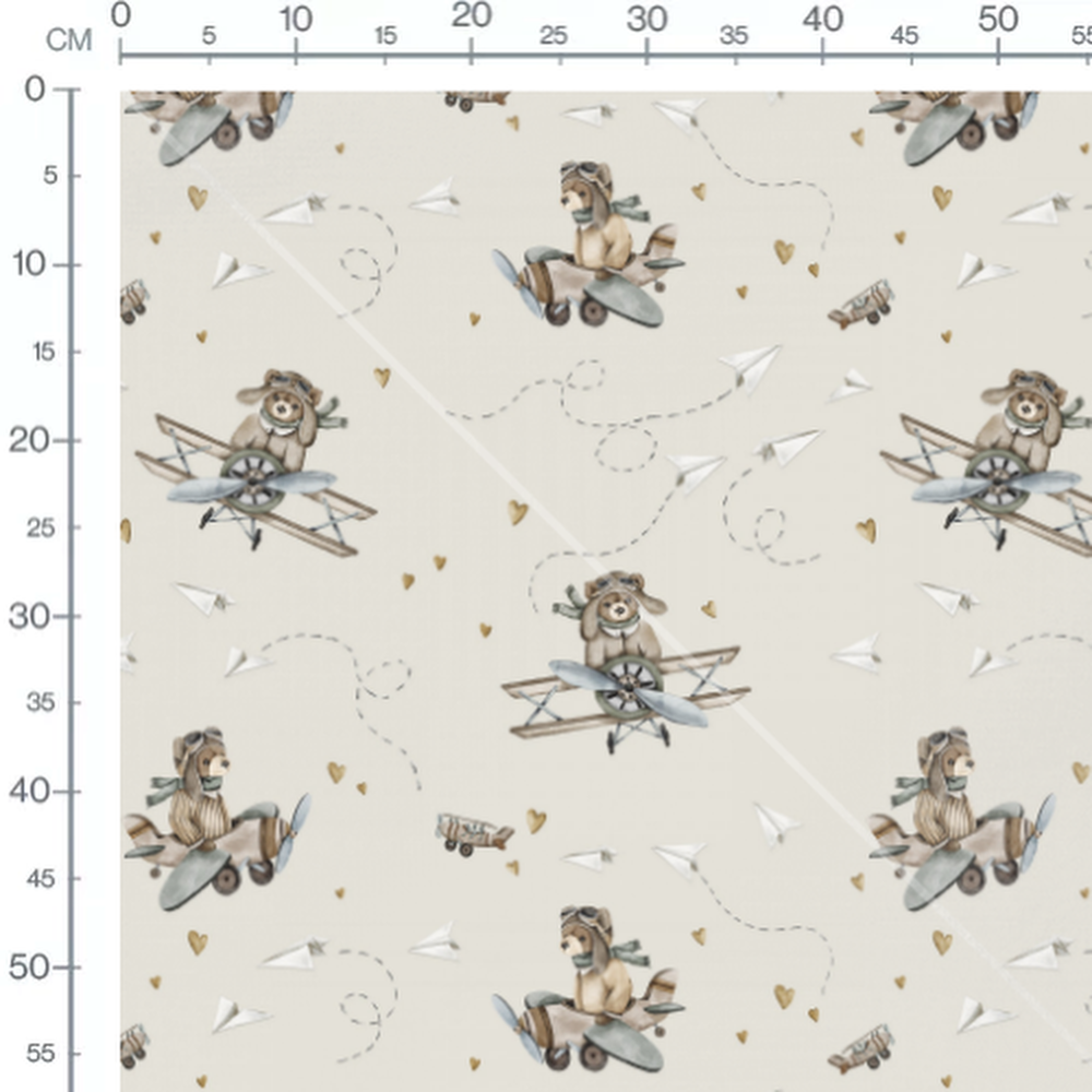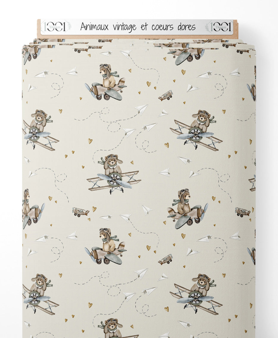 Les animaux portent des casques d'aviateur et sont assis dans des avions vintage. Des avions en papier blancs volent autour des animaux. Les cœurs dorés ajoutent une touche ludique au motif.Les tissus