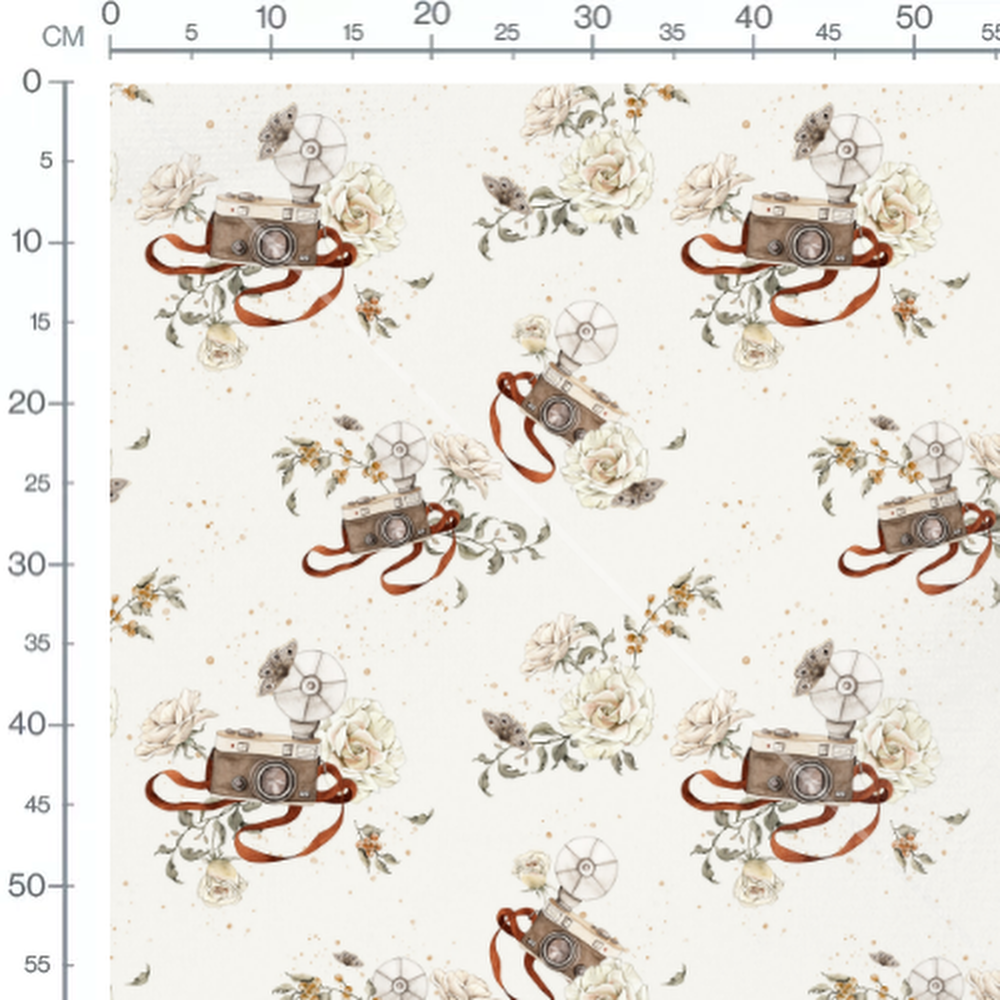 Les appareils photo sont accompagnés de roses délicates et de feuillages. Des papillons ajoutent une touche naturelle au design. Le fond crème met en valeur les éléments vintage et floraux.Les tissus
