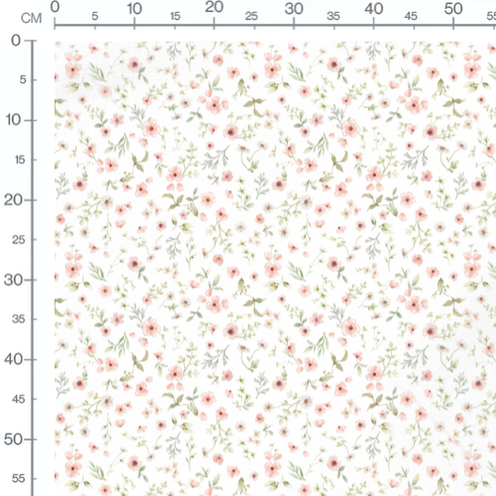 Les fleurs sont de différentes nuances de rose, allant du clair au foncé. Les feuillages sont peints dans des tons de vert doux. Le motif présente une variété de fleurs et de feuilles, créant un effet harmonieux et naturel.Les tissus