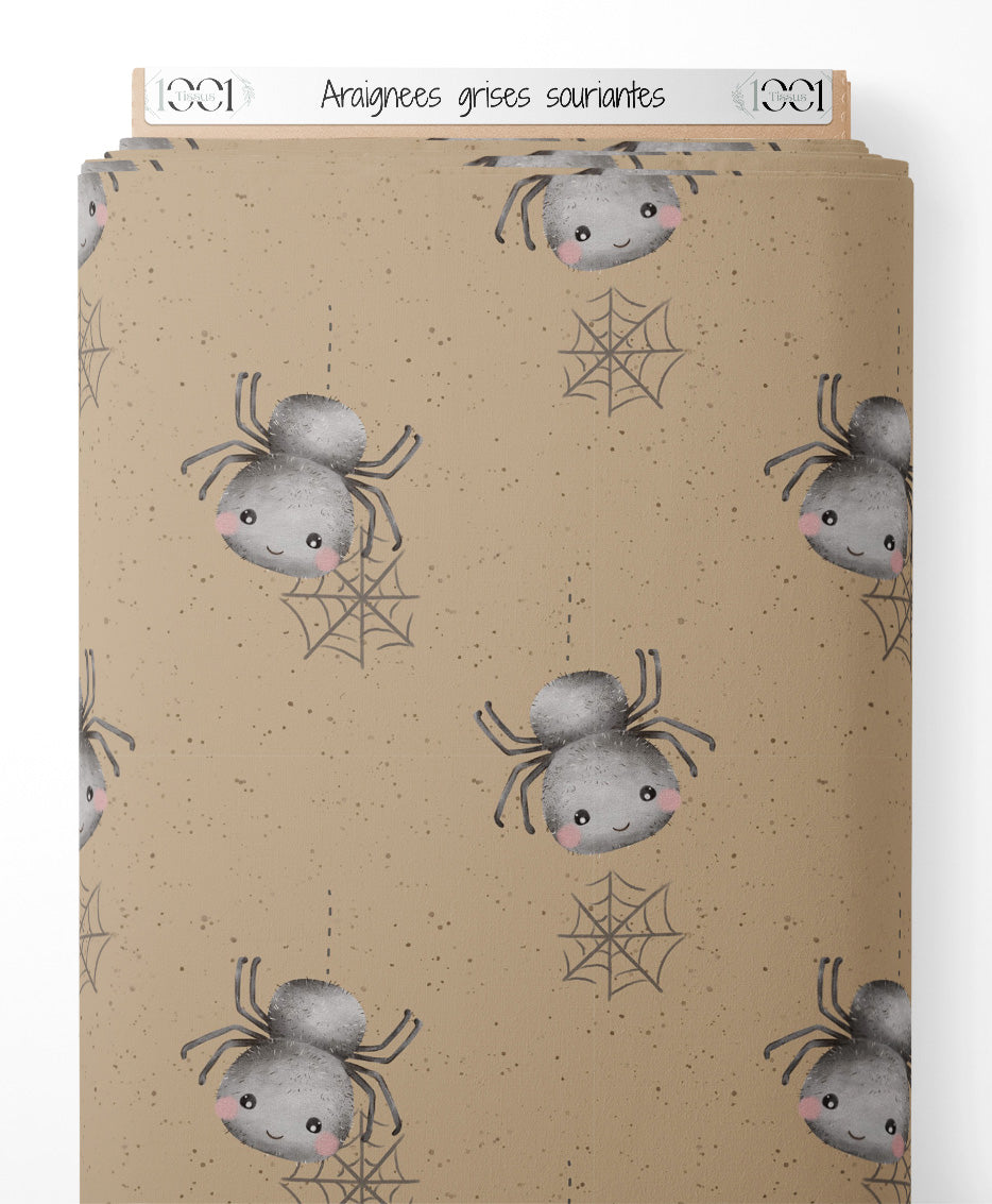 Les araignées ont des joues roses et des sourires. Le fond beige est parsemé de petites taches sombres.Les tissus