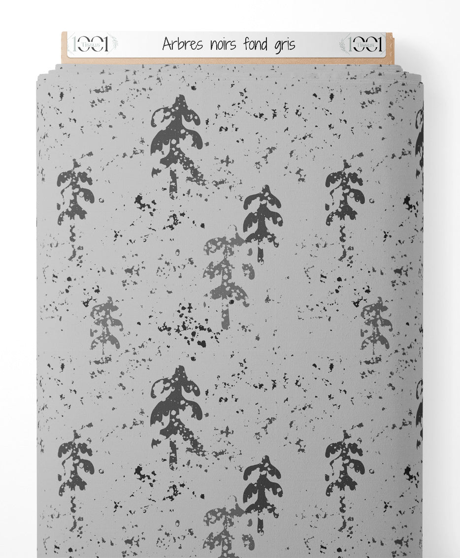 Les arbres sont représentés de manière abstraite avec des formes simplifiées. Le fond gris clair est parsemé de petites taches noires irrégulières.Les tissus