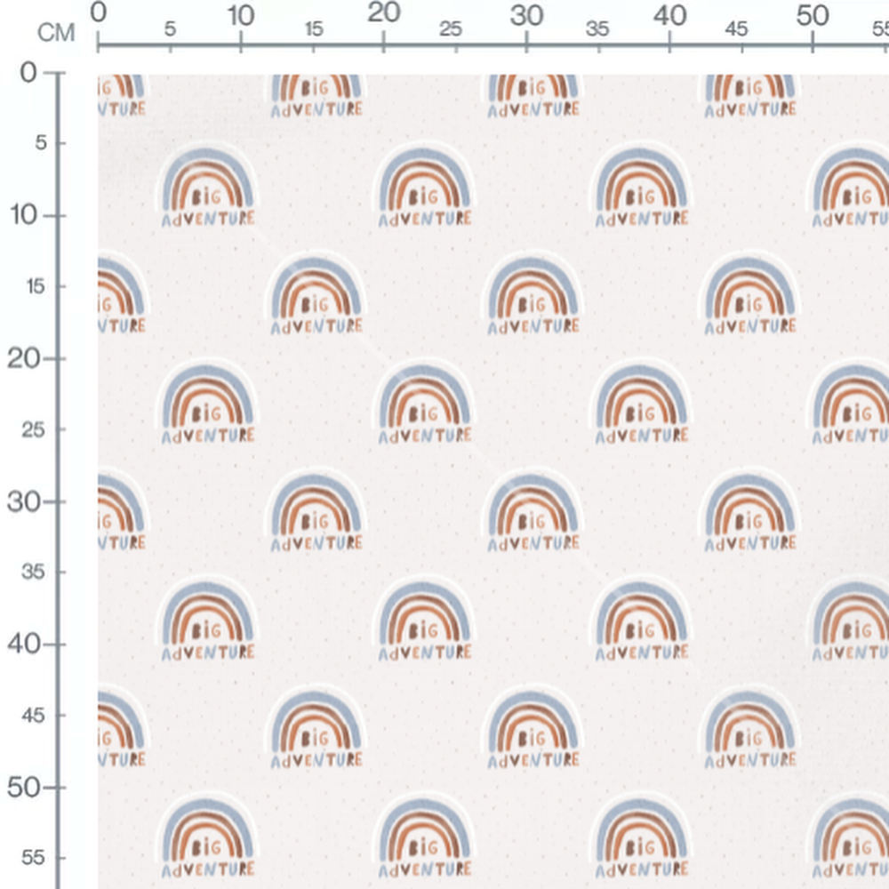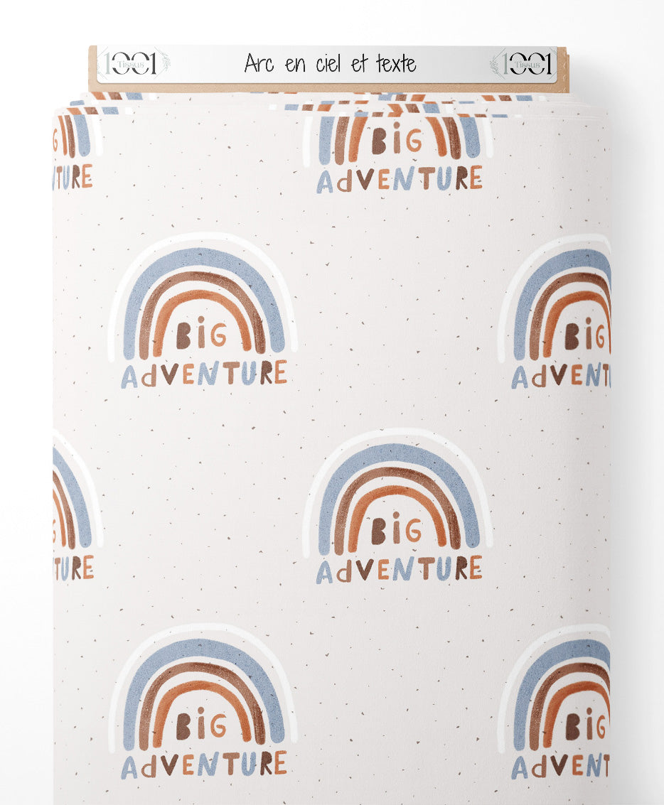 Les arcs-en-ciel sont composés de nuances de marron et de bleu. Le texte 'Big Adventure' est écrit en lettres décontractées. Le fond est blanc avec de petites taches grises dispersées.Les tissus