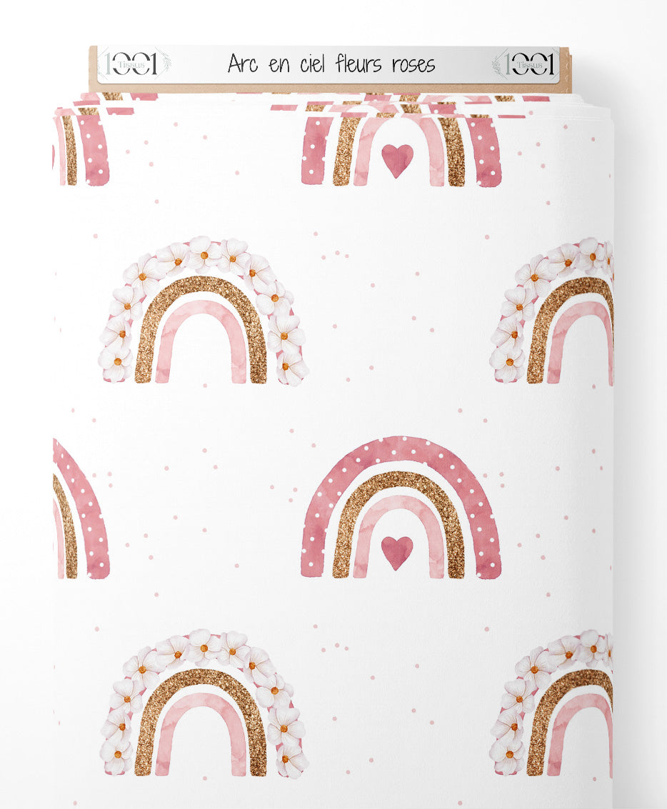 Les arcs-en-ciel sont composés de bandes roses et dorées. Les fleurs blanches décorent l'arc supérieur. Le fond blanc est parsemé de petits points roses.Les tissus
