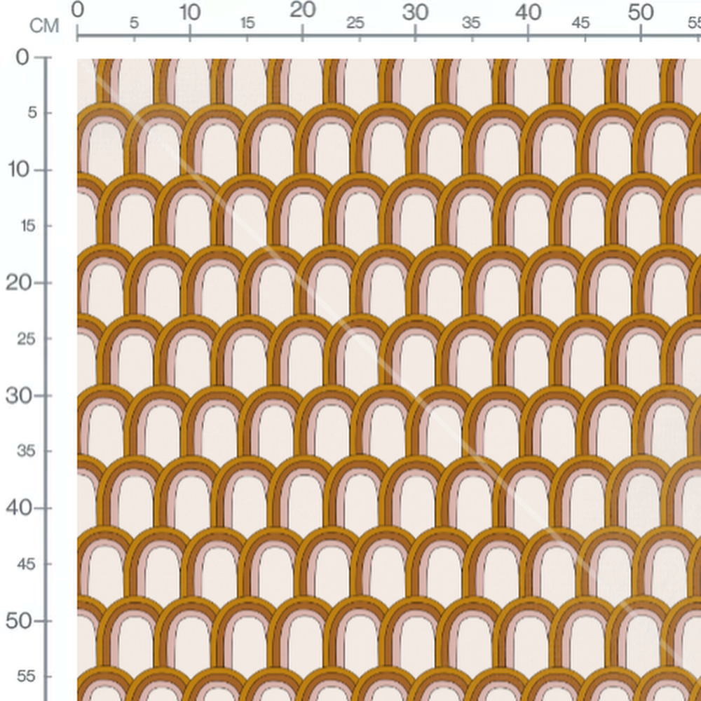 Les arches sont composées de plusieurs nuances de marron et beige. Chaque arche est entourée d'une bordure marron foncé. Le fond crème met en valeur les motifs géométriques.Les tissus